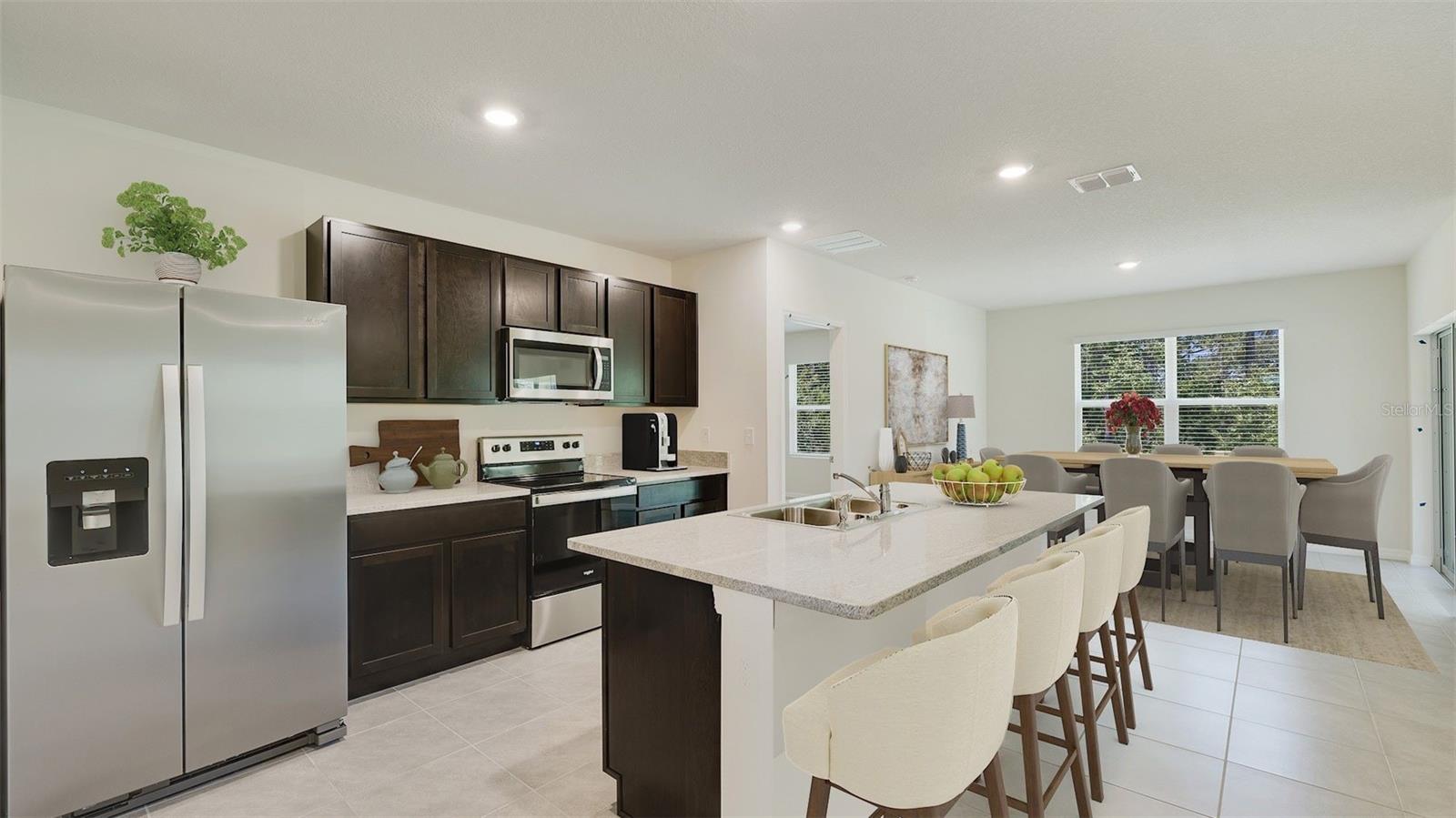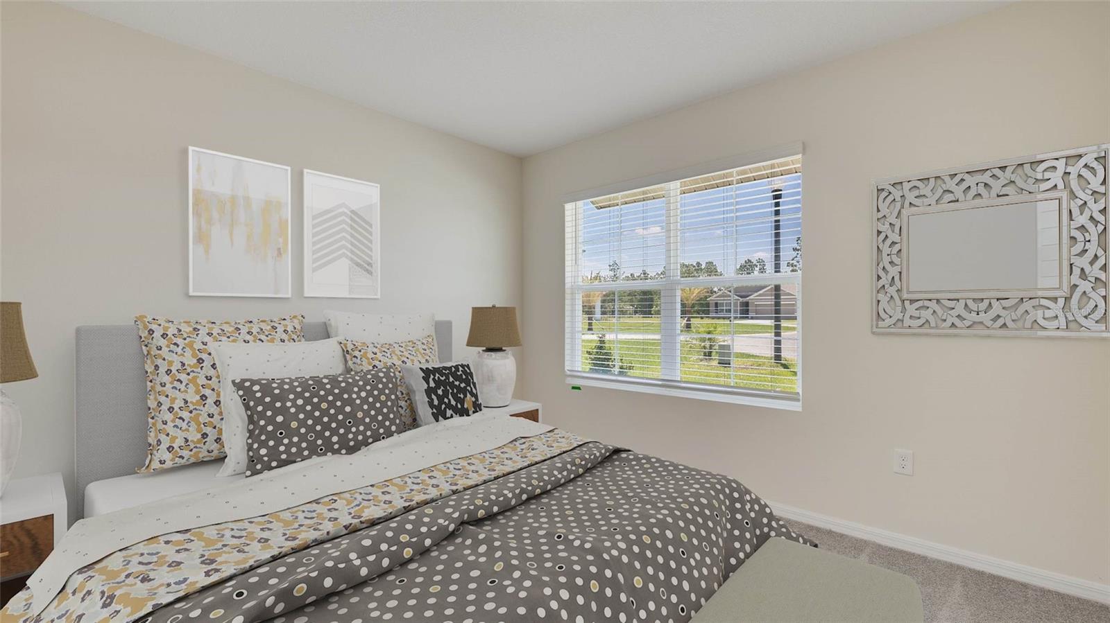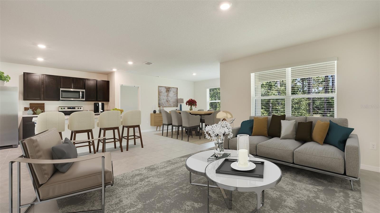This all-concrete block constructed, one-story layout optimizes living space with an open concept kitchen overlooking the living area, dining room, and the outdoor covered lanai. The well-appointed kitchen comes with all appliances, including refrigerator, built-in dishwasher, electric range, and microwave. The Bedroom 1, located at the back of the home for privacy, includes Bathroom 1. Two additional bedrooms share the second bathroom. The third bedroom is located near the laundry room, which is equipped with included washer and dryer. Pictures, photographs, colors, features, and sizes are for illustration purposes only and will vary from the homes as built. Home and community information including pricing, included features, terms and availability. Future Amenity Center to include Clubhouse, Resort Pool, Splash Pad, Playground, Play Lawn, Dog Park and Cable.