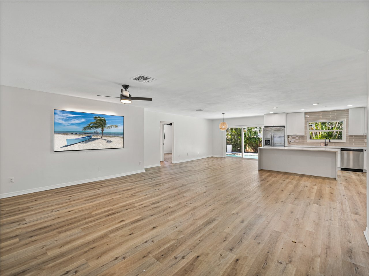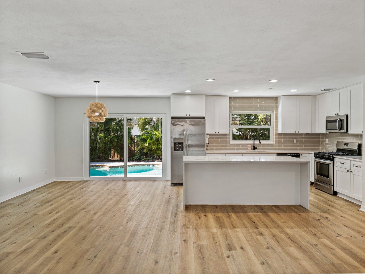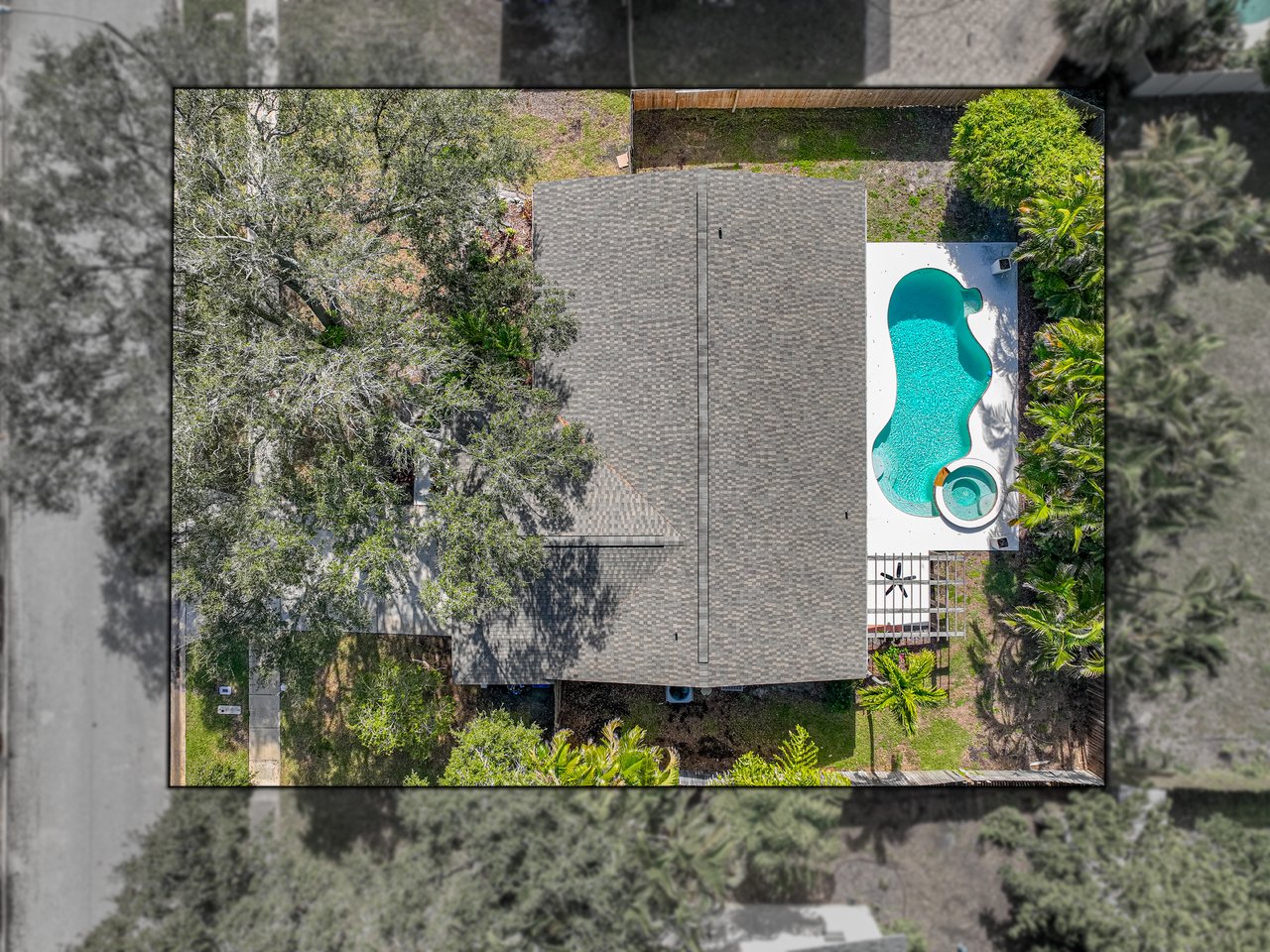 Poolside afternoons in a tropically landscaped oasis, and a beautifully refreshed interior set the tone for this updated St. Petersburg retreat located just minutes from the water. With a 2023 roof, 2024 AC, and newer impact-rated windows and sliding glass doors already in place, this 3 bedroom, 2 bath, 2 car garage pool home offers meaningful upgrades along with the added reassurance that it did not flood during the major hurricanes. Sidewalk-lined streets, mature trees, and a covered front entry with decorative tile flooring introduces the home’s character before you even step inside. You are welcomed into a sweeping, light-filled, open concept layout designed for entertaining and effortless connection. The spacious living room flows naturally into the dining area and kitchen, while sliding glass doors extend the living space directly to the pool deck. Luxury vinyl plank flooring runs throughout the main areas, complemented by updated lighting and fixtures that give the home a clean, modern feel. At the heart of the home, the eat-in kitchen offers a striking focal point with a large island featuring breakfast bar seating and a stone countertop with a waterfall edge. Stainless steel appliances, including a gas range, pair with a stylish backsplash to create a space that is as functional as it is visually impressive. Privately split from the additional bedrooms, the primary suite enjoys direct access to the backyard patio, pergola, and pool area. The suite includes luxury vinyl flooring, a spacious walk-in closet, and an updated ensuite bath featuring decorative tile walls, a newer vanity, and a walk-in shower. Two guest bedrooms sit on the opposite side of the home near the second fully updated bathroom, which offers a tub and shower combination along with designer tile flooring that ensures the home’s charm is carried throughout every room in the house. Authentic Florida living awaits outdoors where the backyard transforms into a private tropical setting. Wood privacy fencing surrounds the space while mature landscaping frames the sparkling swimming pool, creating an ideal backdrop for gatherings, evening swims, or easy alfresco dining beneath the pergola. Beautifully updated and ideally located near beaches, parks, dining, and the many attractions of St. Petersburg, this is a home that places you close to everything the area is known for. Schedule your private showing today!