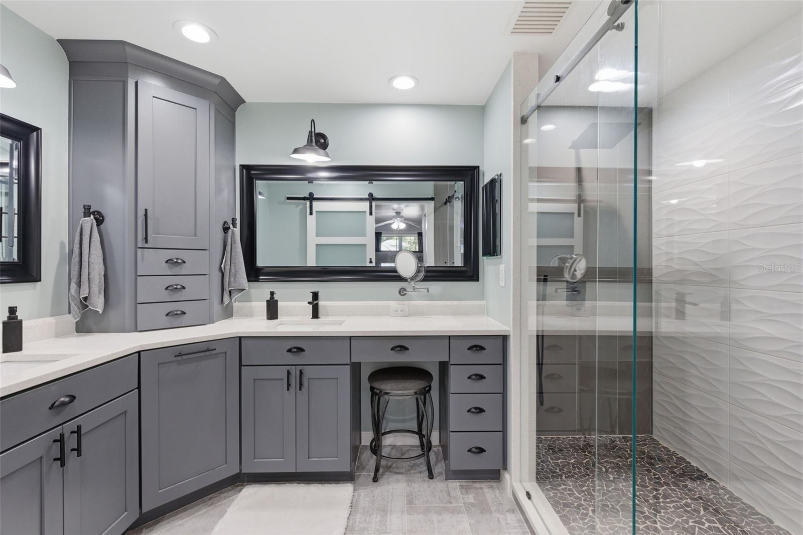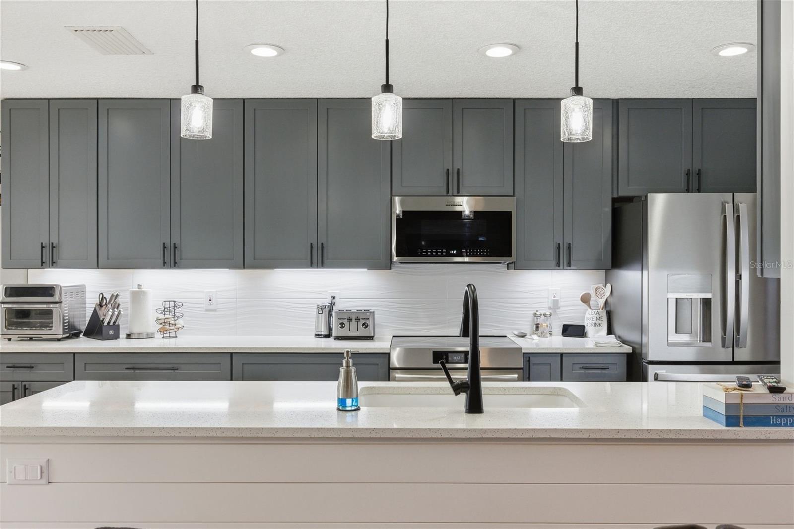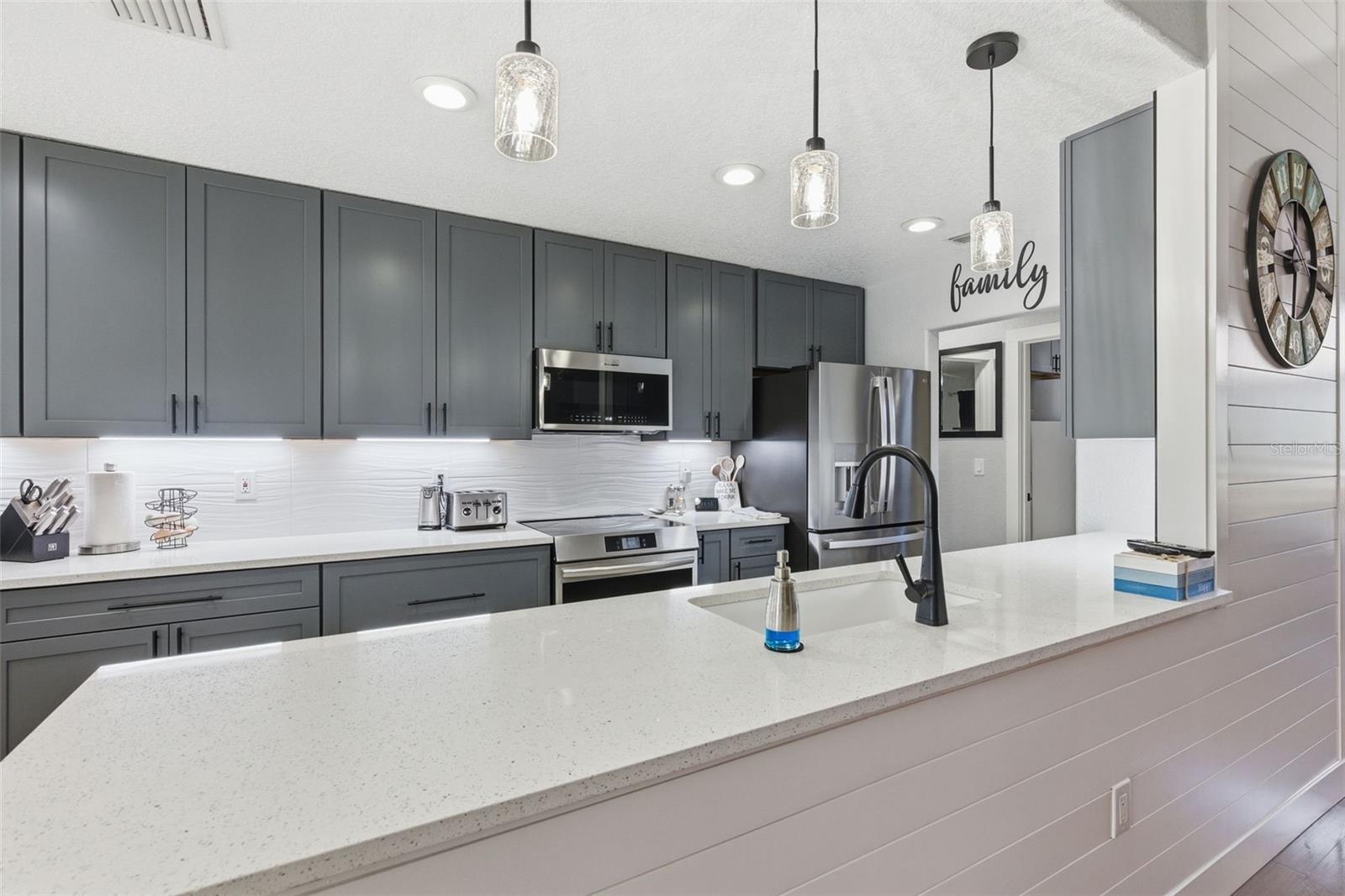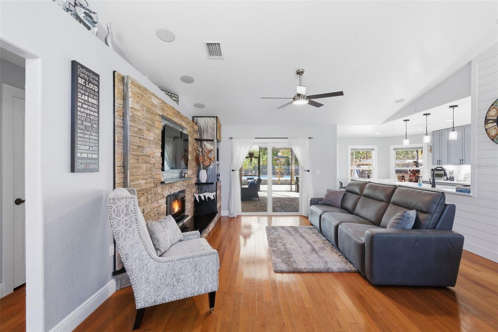 The 2,018 sq. ft. main residence offers three bedrooms and two bathrooms and has been extensively updated. The home was painted in 2025 and features new WINDOWS in 2021(double-pane argon gas-filled) sliders, a back door, and a new ROOF in 2021. The new KITCHEN 2025 showcases quartz countertops with a waterfall edge, soft-close custom cabinets (pull-out shelves in base cabinets), undercabinet lighting, and a touchless faucet, and includes an induction range, microwave, dishwasher, refrigerator, and full-size stackable NEW WASHER & DRYER 2025. The Primary bath was updated in 2020 with a large, dual-head shower featuring glass doors and accented by a barn slider entry door, and a new LAUNDRY room in 2025 includes cabinets. Additional living space includes a 20x50 screened recreational room, ideal for year-round enjoyment.