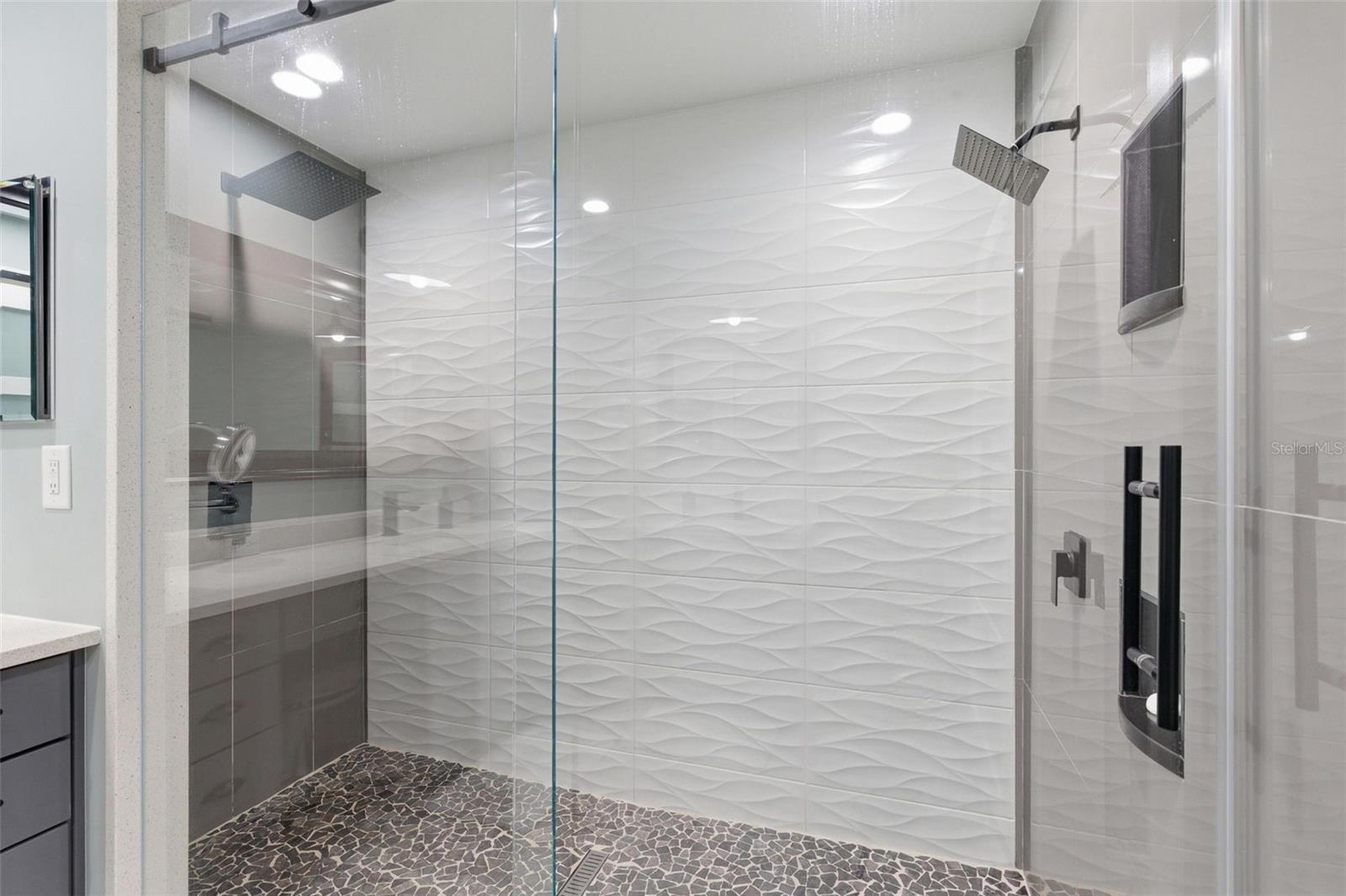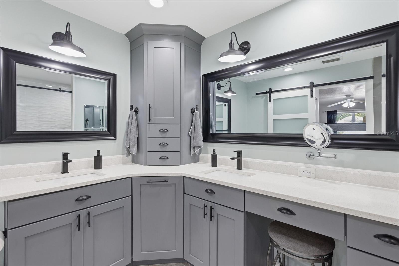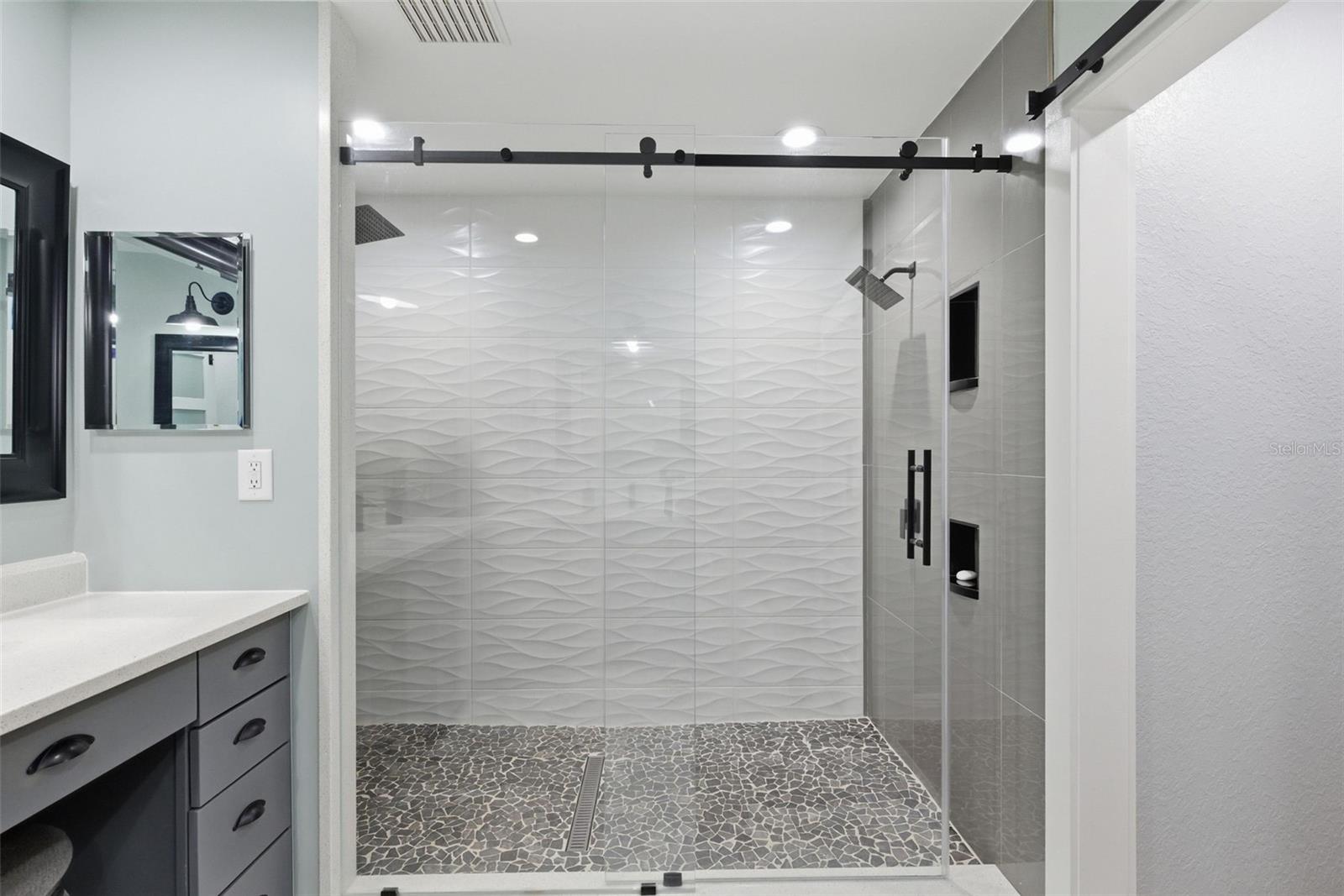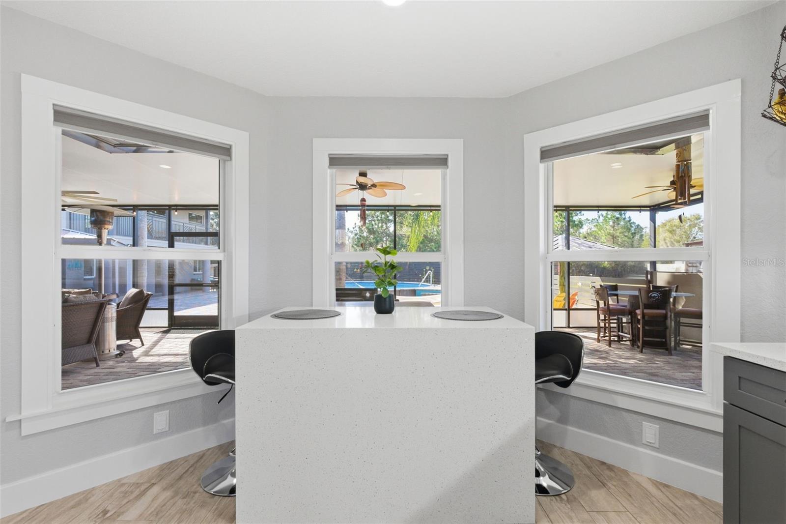 The 2,018 sq. ft. main residence offers three bedrooms and two bathrooms and has been extensively updated. The home was painted in 2025 and features new WINDOWS in 2021(double-pane argon gas-filled) sliders, a back door, and a new ROOF in 2021. The new KITCHEN 2025 showcases quartz countertops with a waterfall edge, soft-close custom cabinets (pull-out shelves in base cabinets), undercabinet lighting, and a touchless faucet, and includes an induction range, microwave, dishwasher, refrigerator, and full-size stackable NEW WASHER & DRYER 2025. The Primary bath was updated in 2020 with a large, dual-head shower featuring glass doors and accented by a barn slider entry door, and a new LAUNDRY room in 2025 includes cabinets. Additional living space includes a 20x50 screened recreational room, ideal for year-round enjoyment.