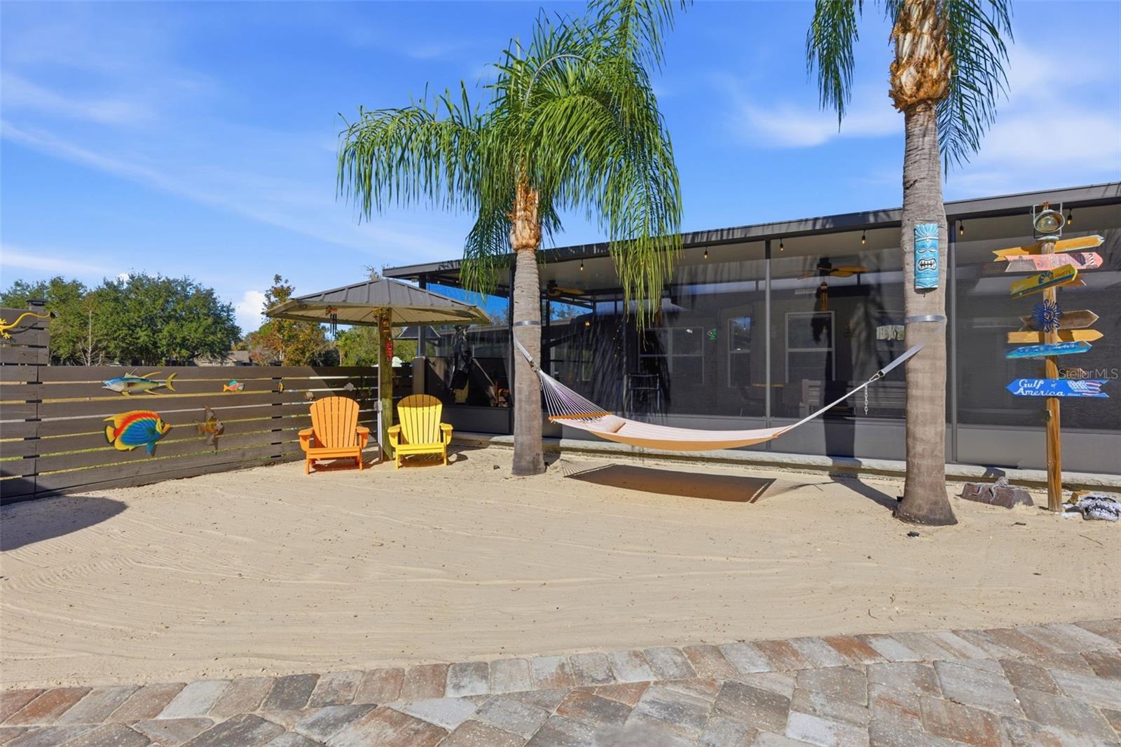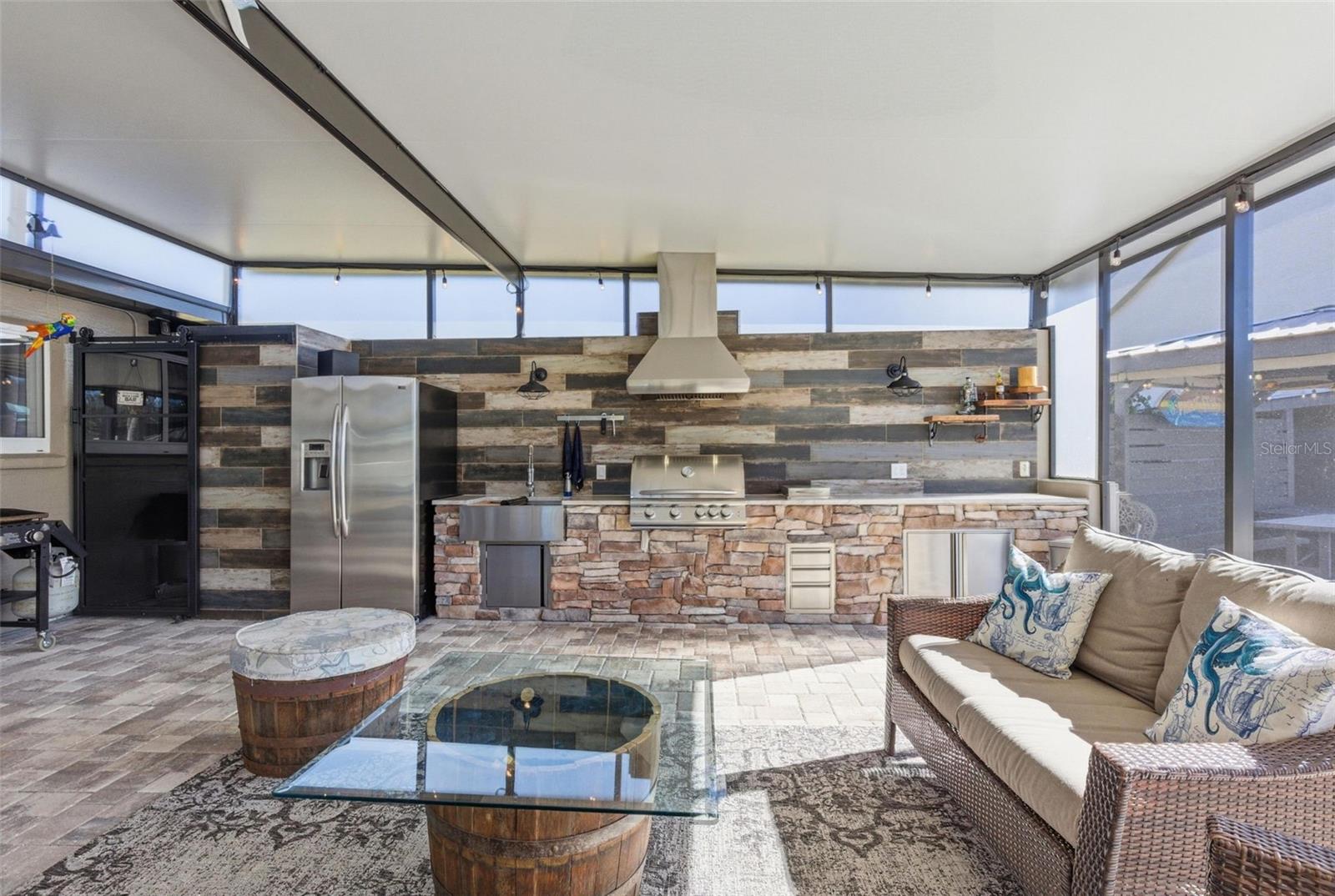 Outdoor living is exceptional with new OUTDOOR LIVING 2022, featuring a paved 25x50 lanai with an outdoor kitchen complete with a grill, side burner, exhaust hood, refrigerator, sink, under-counter cabinets, and granite countertops, plus a gas fireplace with mantle and 65-inch television. The 24? round pool area includes a large paved deck and white sand sunning area, gazebo, covered outdoor shower with hot and cold, sundeck, and low-voltage lighting throughout, creating a private resort-style setting.