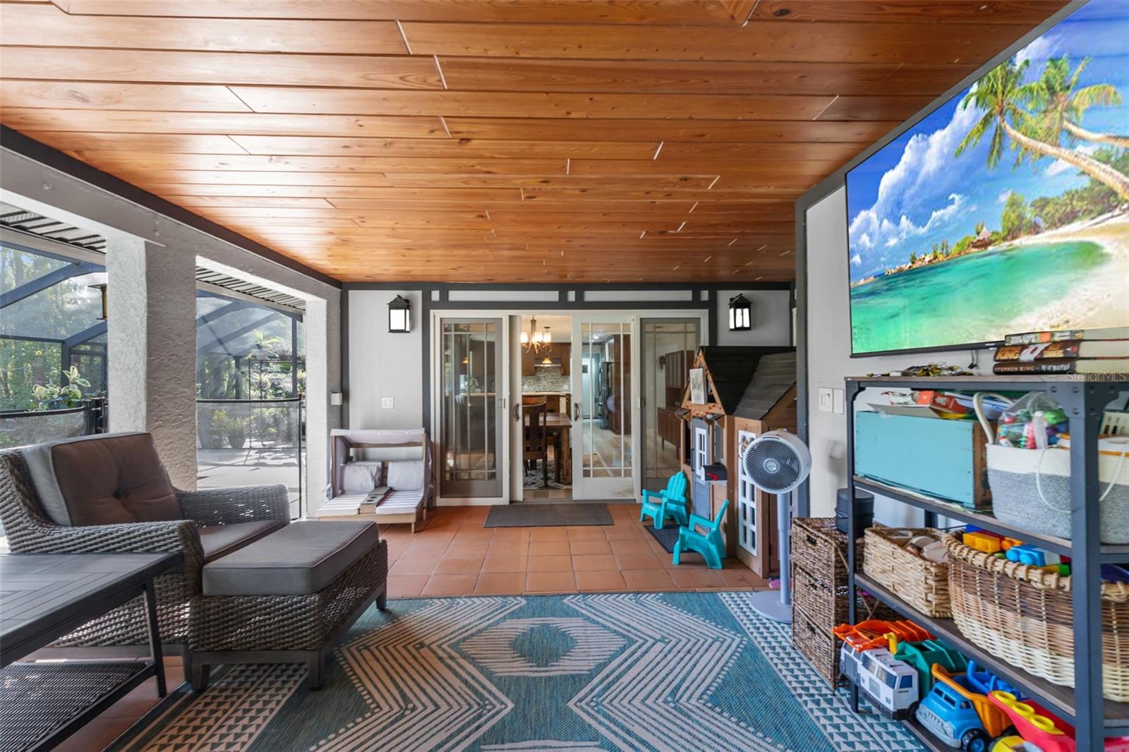 The gourmet kitchen features custom cabinetry, stainless steel appliances, a reverse osmosis system, and generous storage. Anderson sliding doors lead to a private outdoor living space with a heated, self-cleaning saltwater pool, covered lanai, double screen-enclosed patios, and an electric fireplace. A new POOL PUMP in 2025.