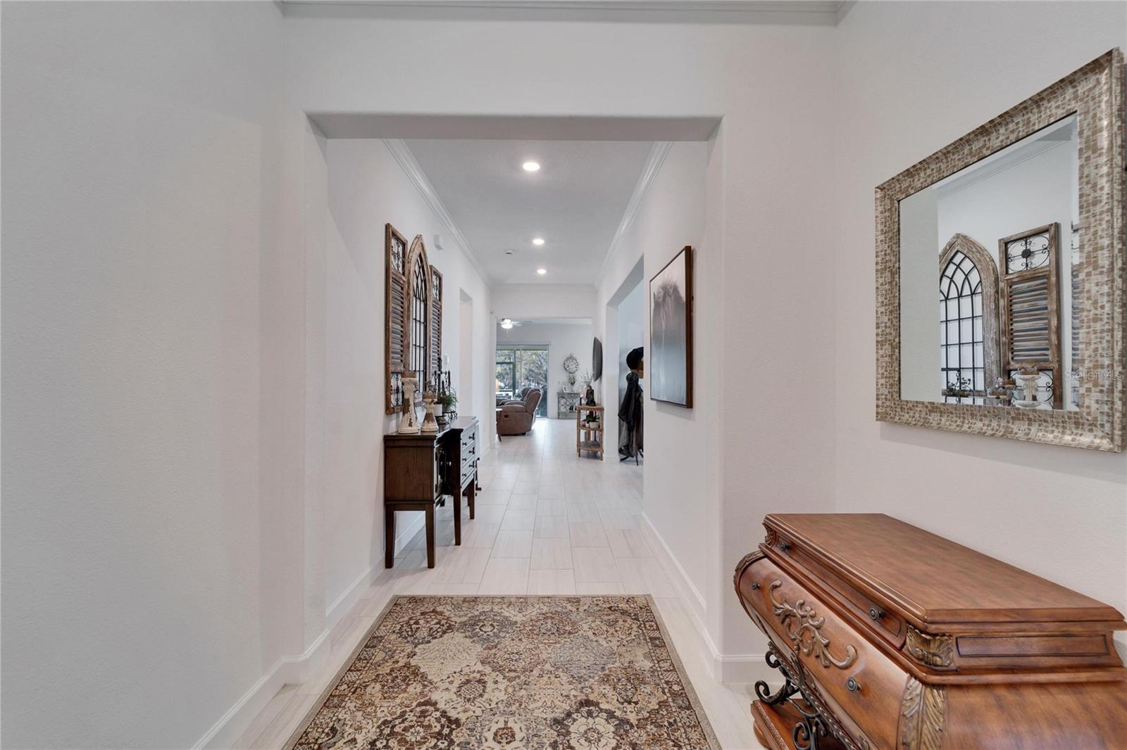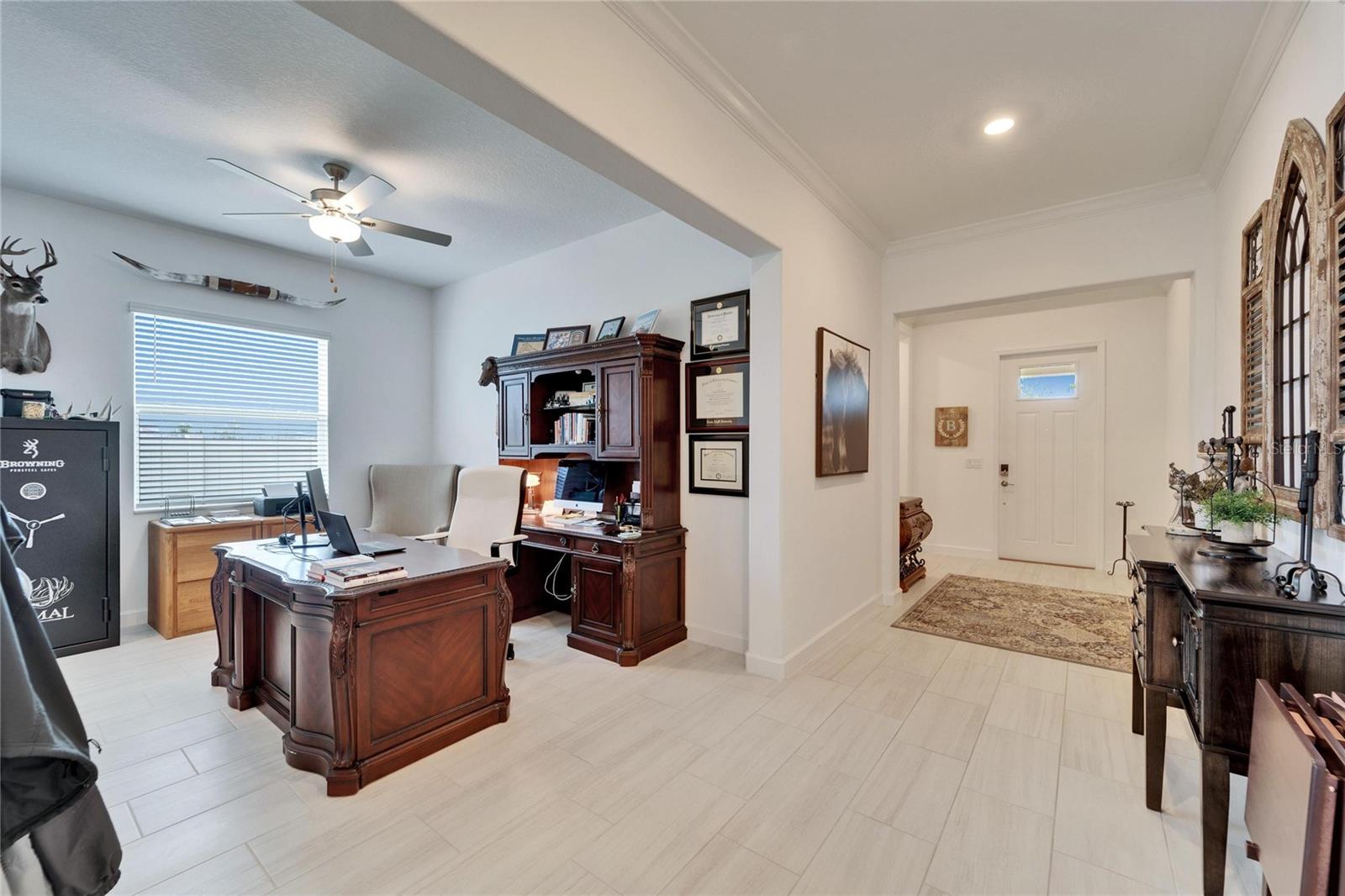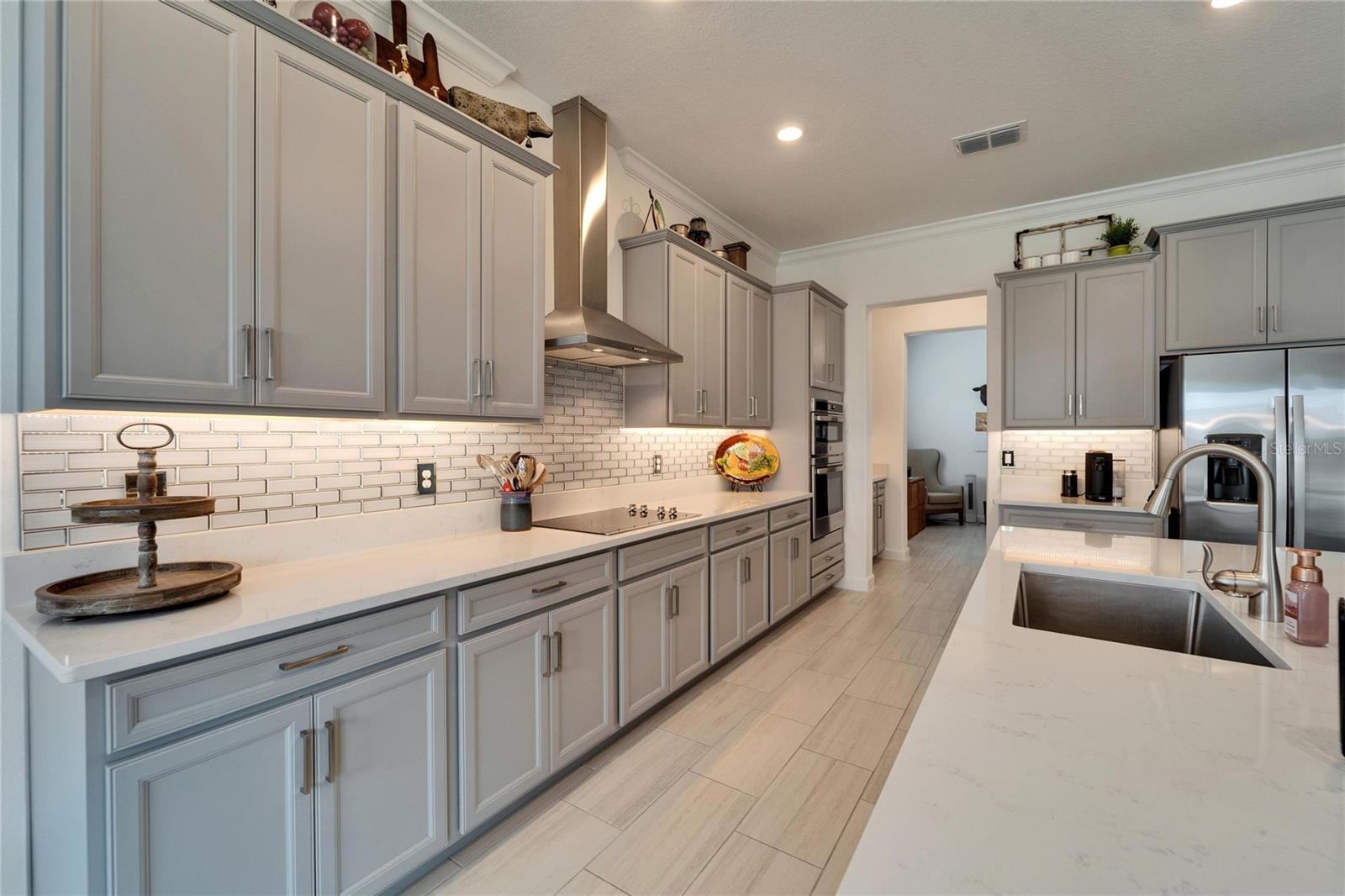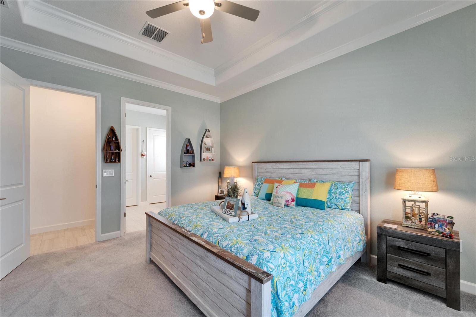 This exceptional home is nestled on an oversized lot on a Cul-de-Sac street! This beautifully designed 3-bedroom, 4-bathroom home offers the perfect blend of luxury, space, and privacy! In addition you have a flex space and upstairs storage space! The upstairs space can be finished into a huge loft with many potential functions! Each of the bedrooms have an ensuite bath, ensuring ultimate comfort and convenience for family and guests! The home boasts quartz countertops throughout, crown molding, luxury tile and 52" ceiling fans in every room, adding both elegance and functionality. The chef's kitchen features an additional butlers pantry, stylish tile backsplash, ample cabinet space, and a modern, open layout perfect for entertaining. Step outside to enjoy the oversized screened lanai, high-elevation lot that backs up to a conservation area providing tons of space and a tranquil, scenic backdrop. The fully fenced yard with double gates, paver driveway, and three-car garage add to the home's appeal, while the screened-in lanai offers the perfect space to unwind and take in the natural surroundings.