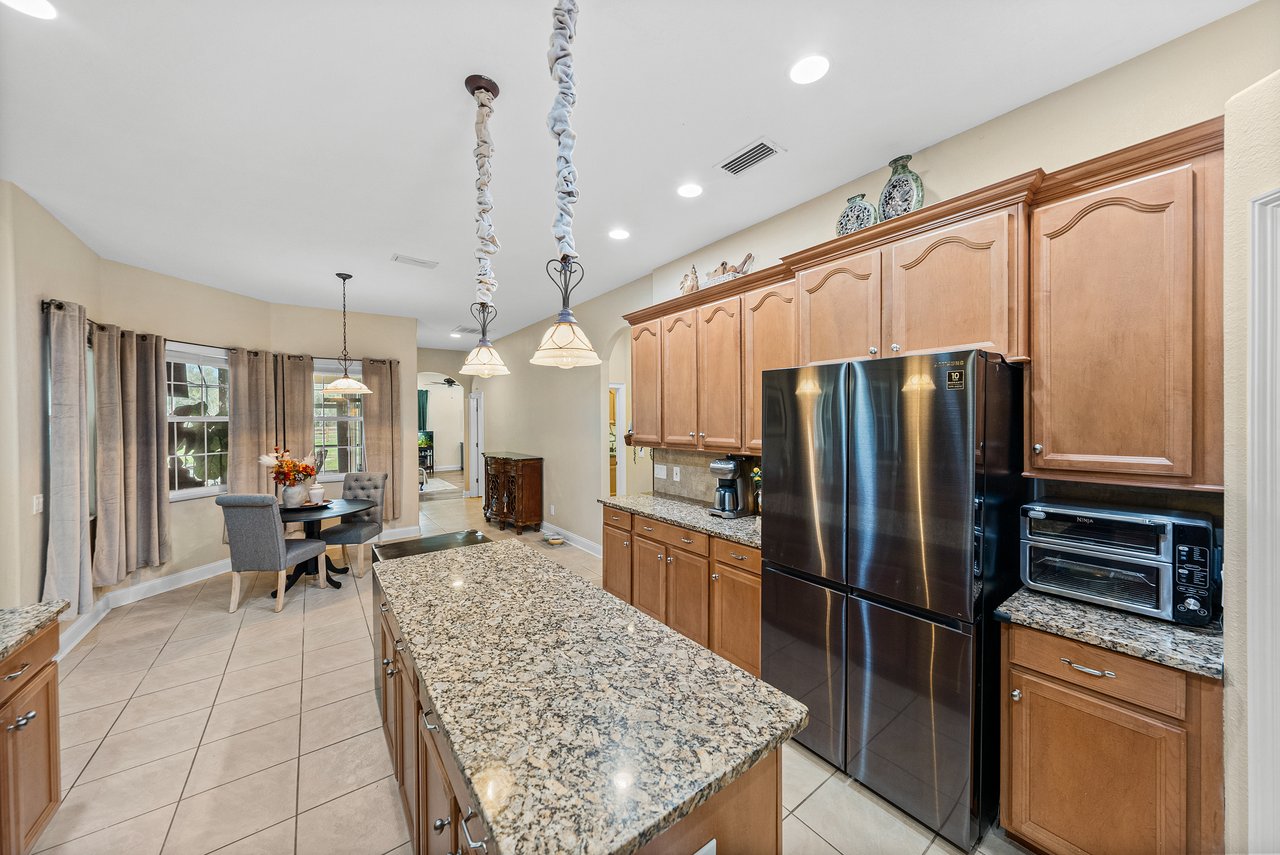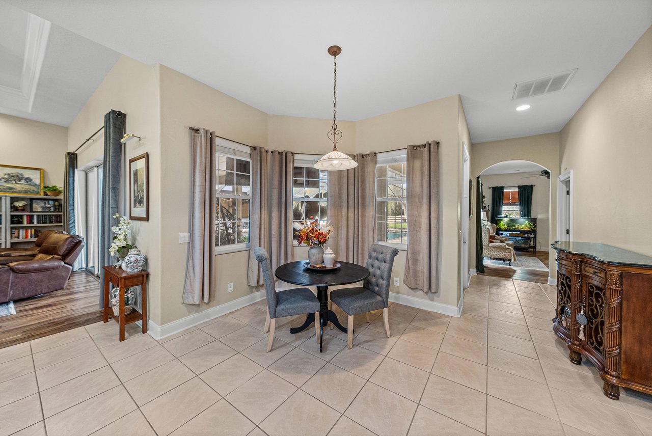 breakfast bar seating, a roomy pantry, and an eat-in dinette. A second oversized living space with triple sliding doors
