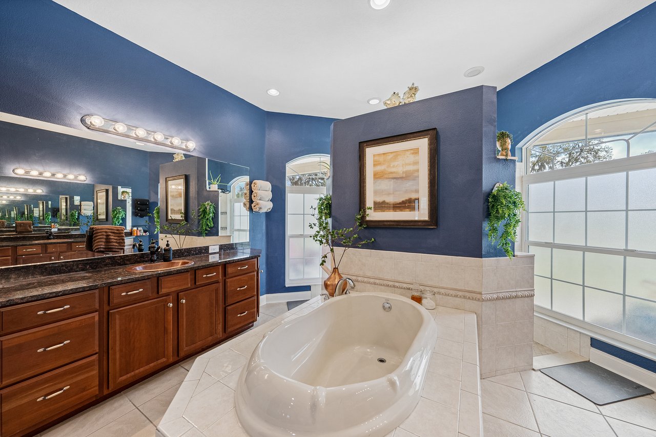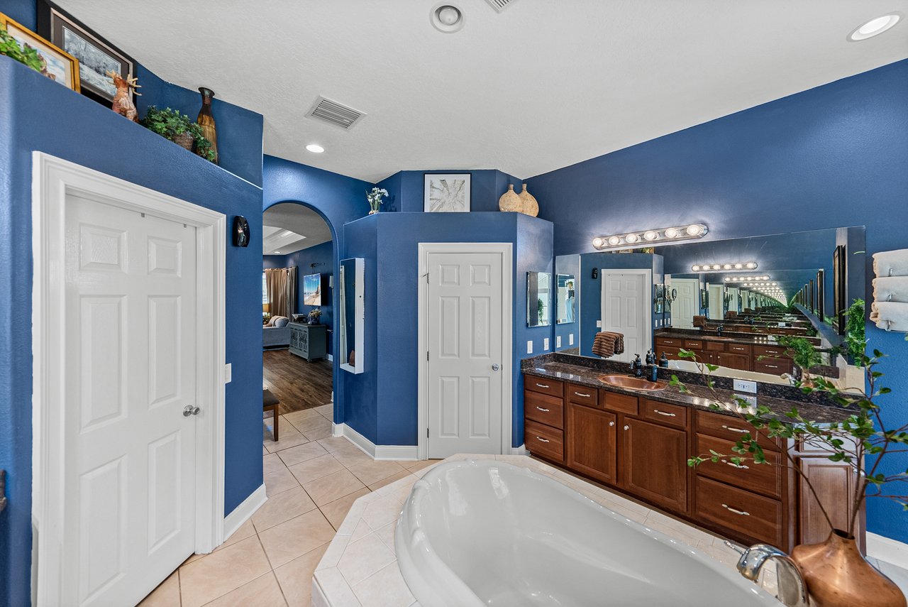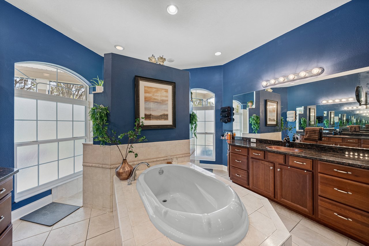 enormous walk-in closet with built-ins and a vanity station. The en suite bath features a soaking tub, dual granite
