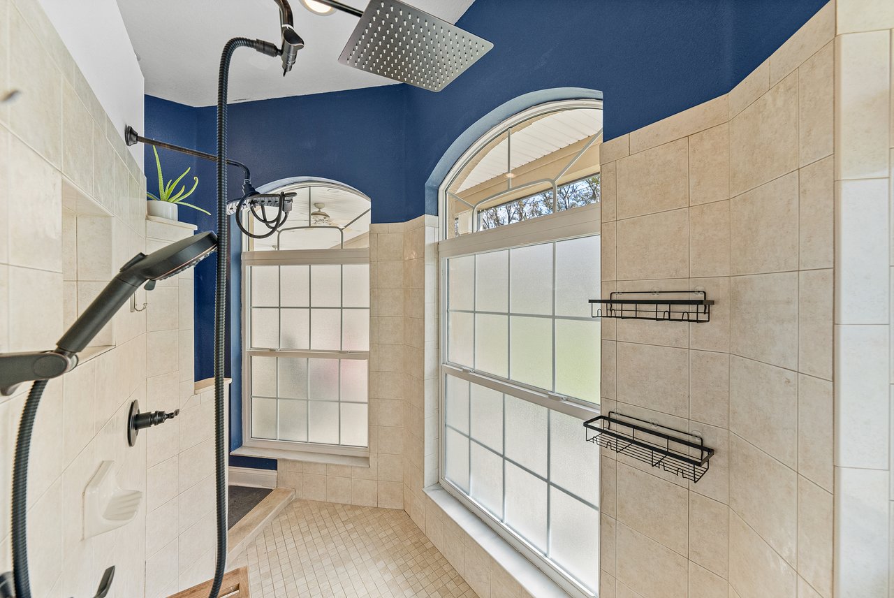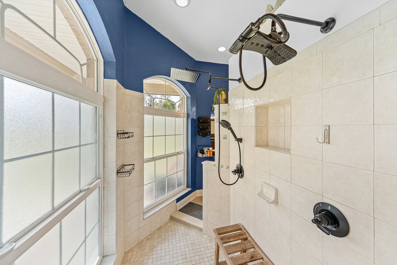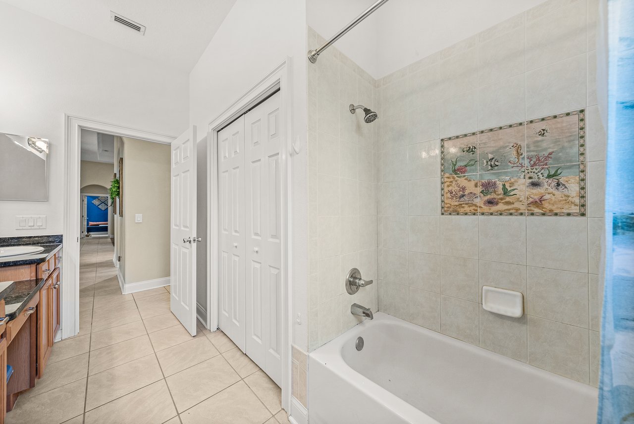 enormous walk-in closet with built-ins and a vanity station. The en suite bath features a soaking tub, dual granite