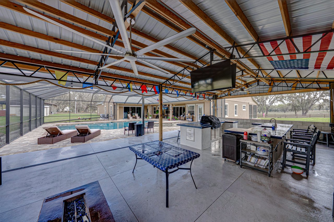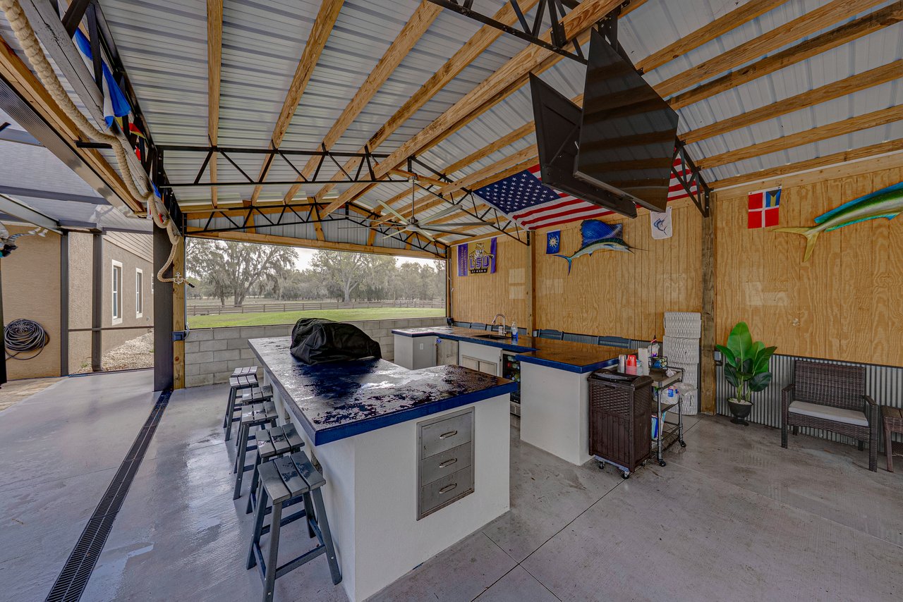 seating for 10+, a built-in grill, sink, refrigerators, and a covered lounge area. The land itself is fully fenced and