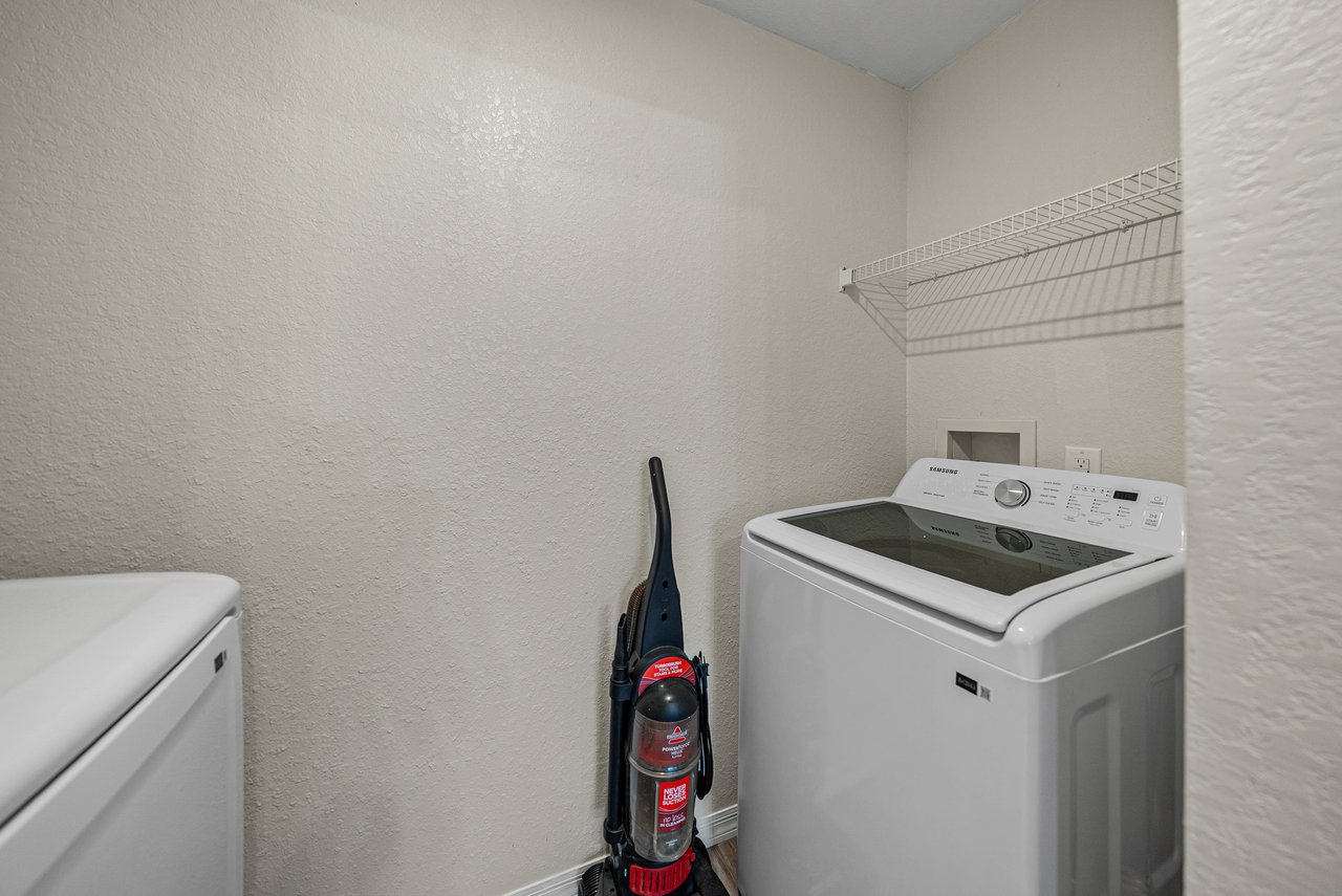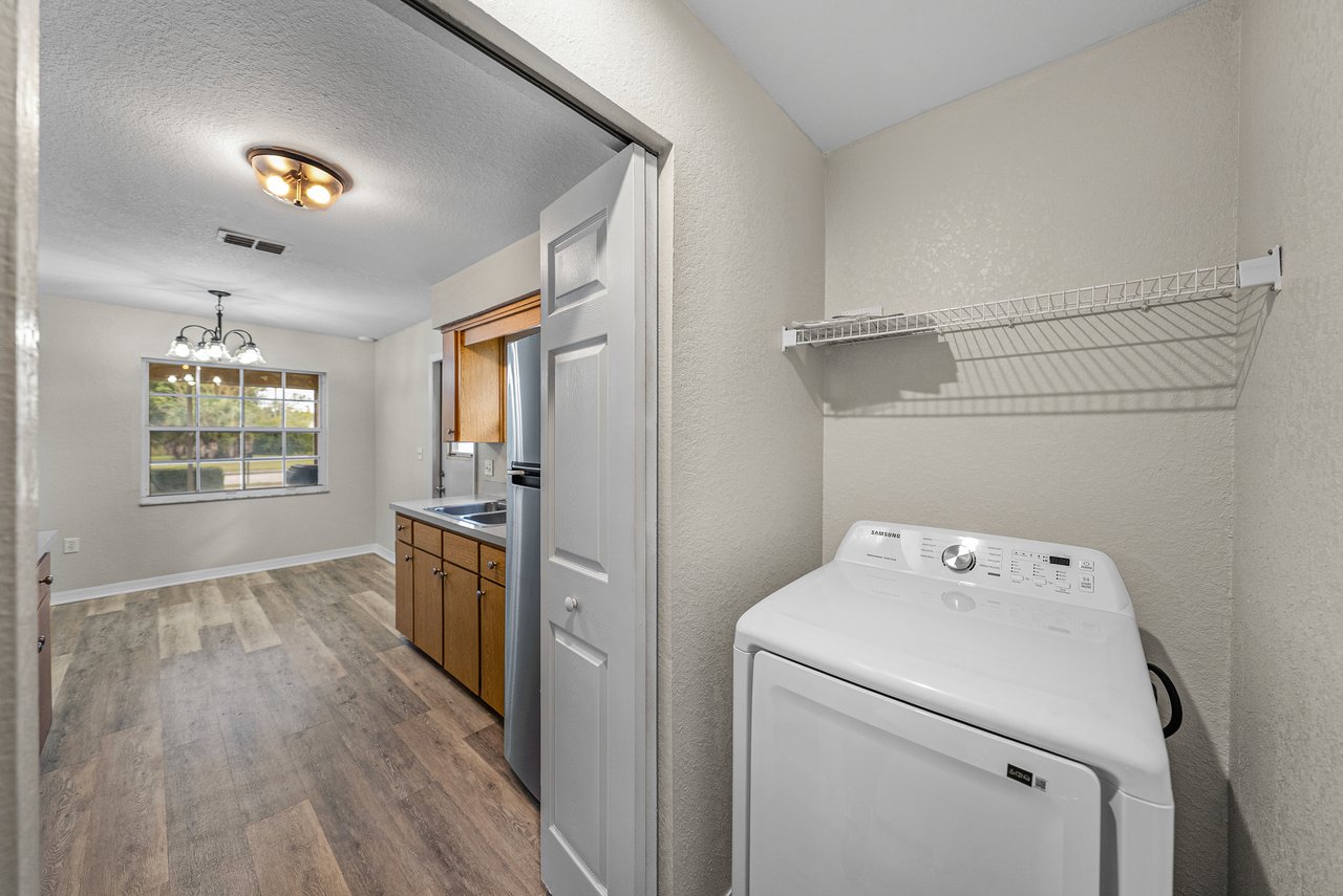 and dryer, making daily routines simple and efficient. Down the hall, all three bedrooms are
