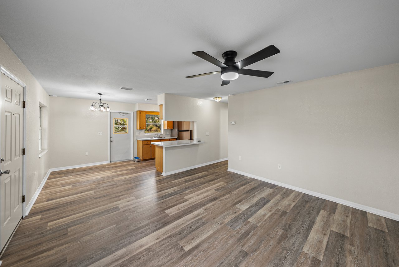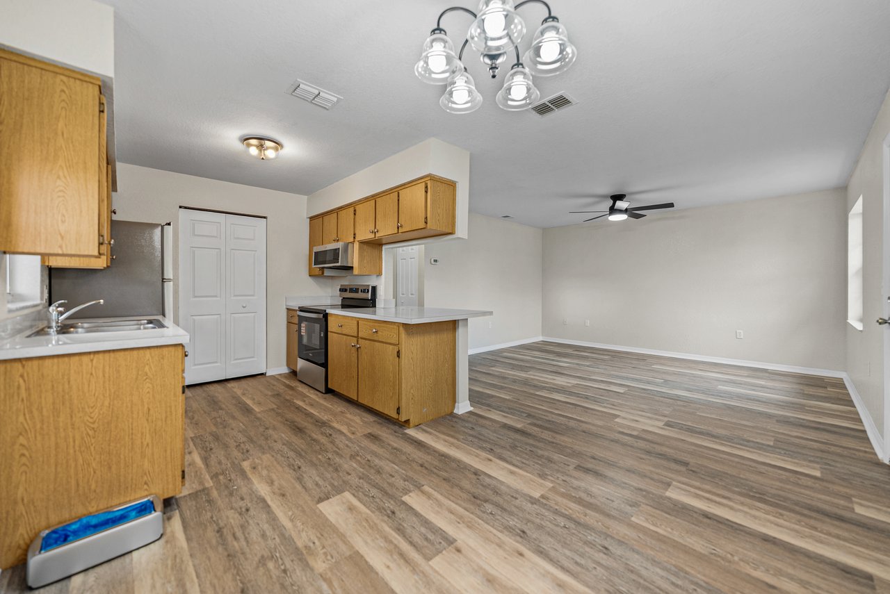 and light fixtures throughout. The open living and dining area flows easily into the galley-style