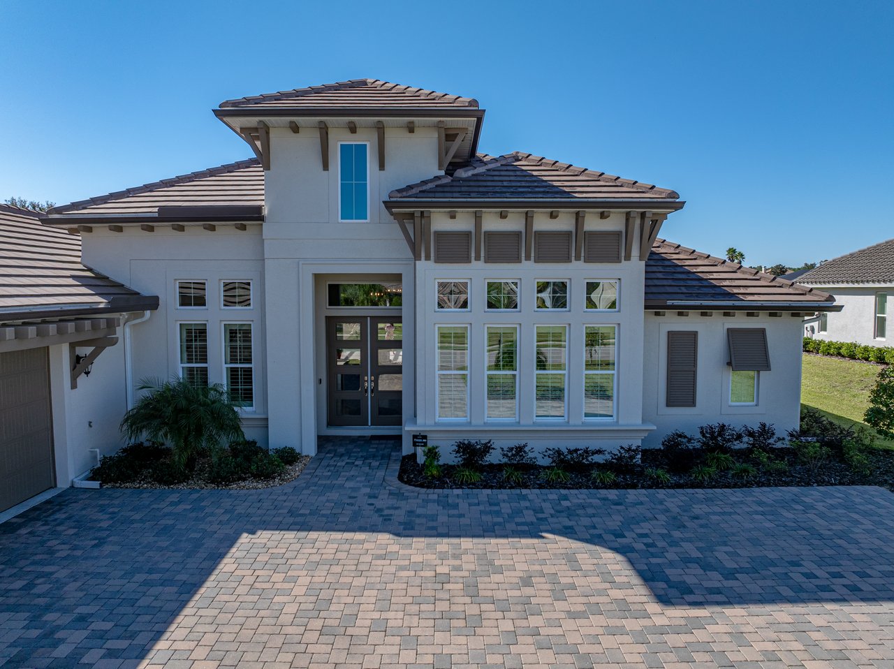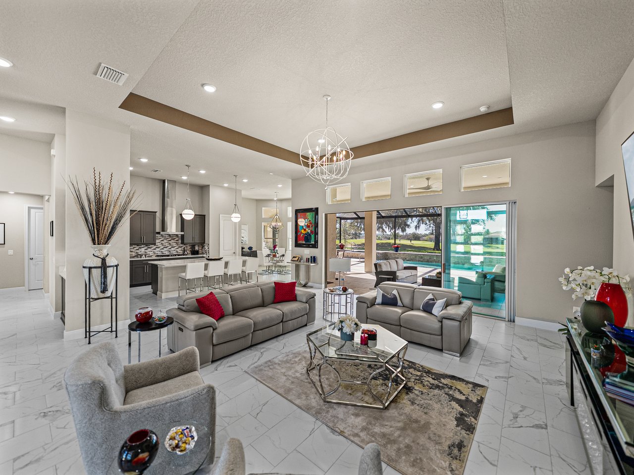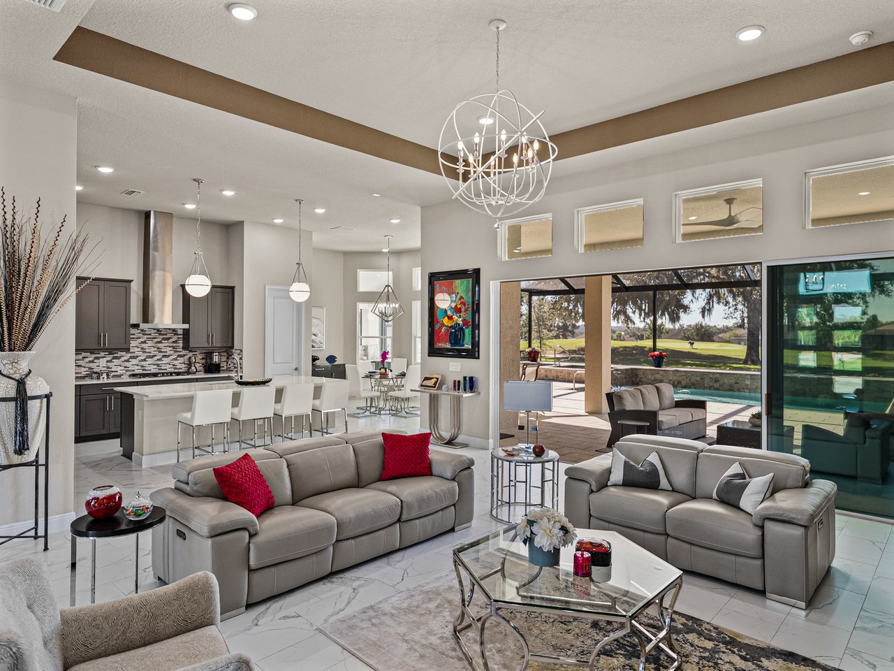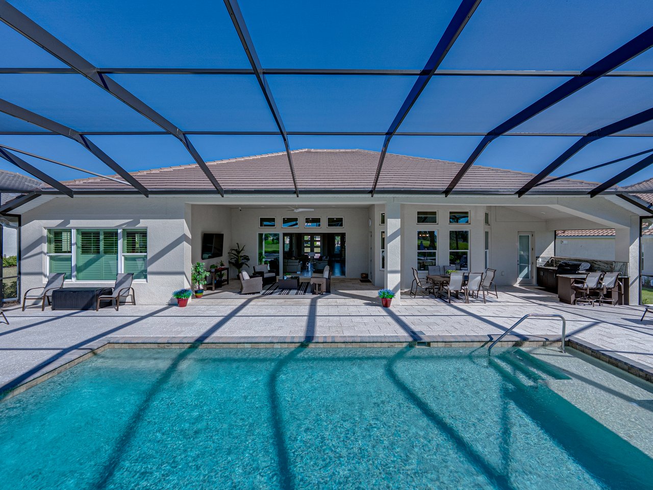 This exceptional new listing in Lake Jovita truly embodies luxury Florida living. This newly built, 3,174 sq ft pool home is situated on nearly half an acre with stunning golf course views, offering three bedrooms plus an office, and 3.5 baths. The curb appeal is meticulously designed with manicured landscaping, a paver driveway, and an oversized three-car garage. Over $250,000 in upgrades have transformed the backyard into a private oasis. Step inside to discover a residence where quality craftsmanship meets modern elegance. Twelve-foot ceilings create dramatic volume, complemented by porcelain tile flooring, upscale light fixtures, and plantation shutters throughout. The open and airy layout features quad sliding glass doors that lead to a high-end Shellock pool deck, seamlessly blending indoor and outdoor entertaining.The heart of the home is a stunning and functional kitchen, complete with quartz countertops, an island with seating for four, stainless steel appliances (including a gas cooktop and built-in oven), a hidden walk-in pantry, and a custom pass-through bar with a wine refrigerator that connects to the dedicated dining room. An office or additional living room provides an ideal workspace, while the primary suite offers a lavish retreat with two walk-in closets and a spa-inspired bath featuring a freestanding soaking tub and walk-in shower. Two guest suites, located on the opposite side of the home, each include a private full bathroom and walk-in closets, with one offering convenient pool access. The outdoor living space is equally impressive, featuring a screened lanai with Shellock pavers, a covered seating area overlooking the golf course, and a fully equipped outdoor kitchen with a grill, wet bar, refrigerator, and bar seating. The heated saltwater pool and spa, complete with Pentair equipment, provide the perfect escape from the Florida sun. Lake Jovita's resort-style amenities further enhance the experience, with optional access to two championship golf courses, a clubhouse, tennis and pickleball courts, dog parks, a fitness center, and scenic walking trails. I invite you to take the first step toward the Lake Jovita lifestyle by calling today to schedule a personal tour of this extraordinary home.