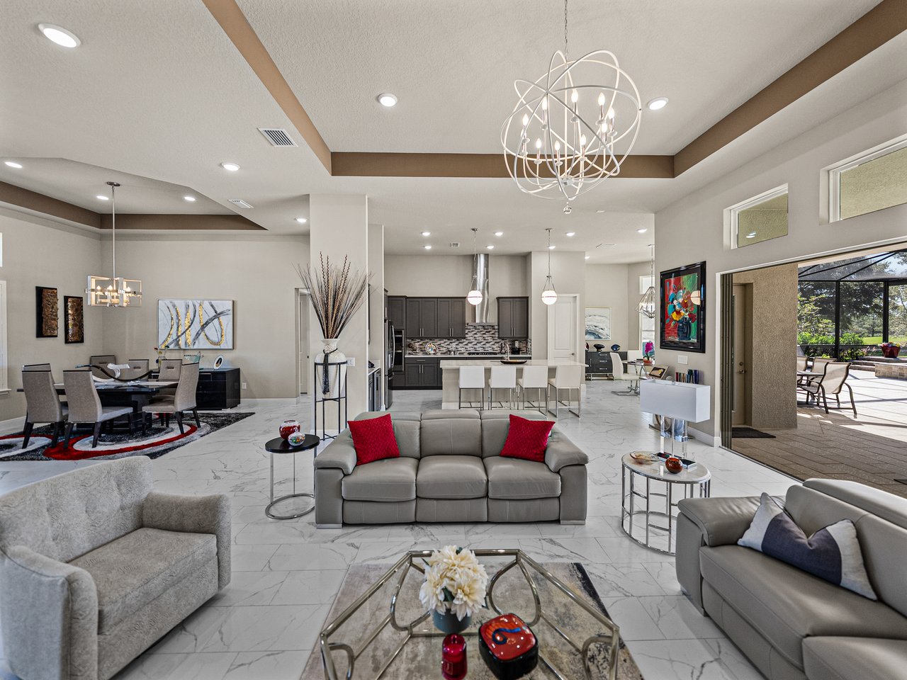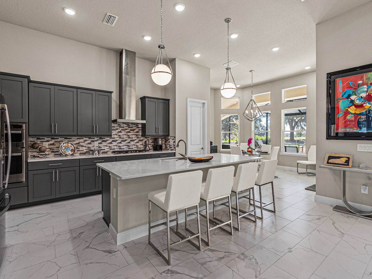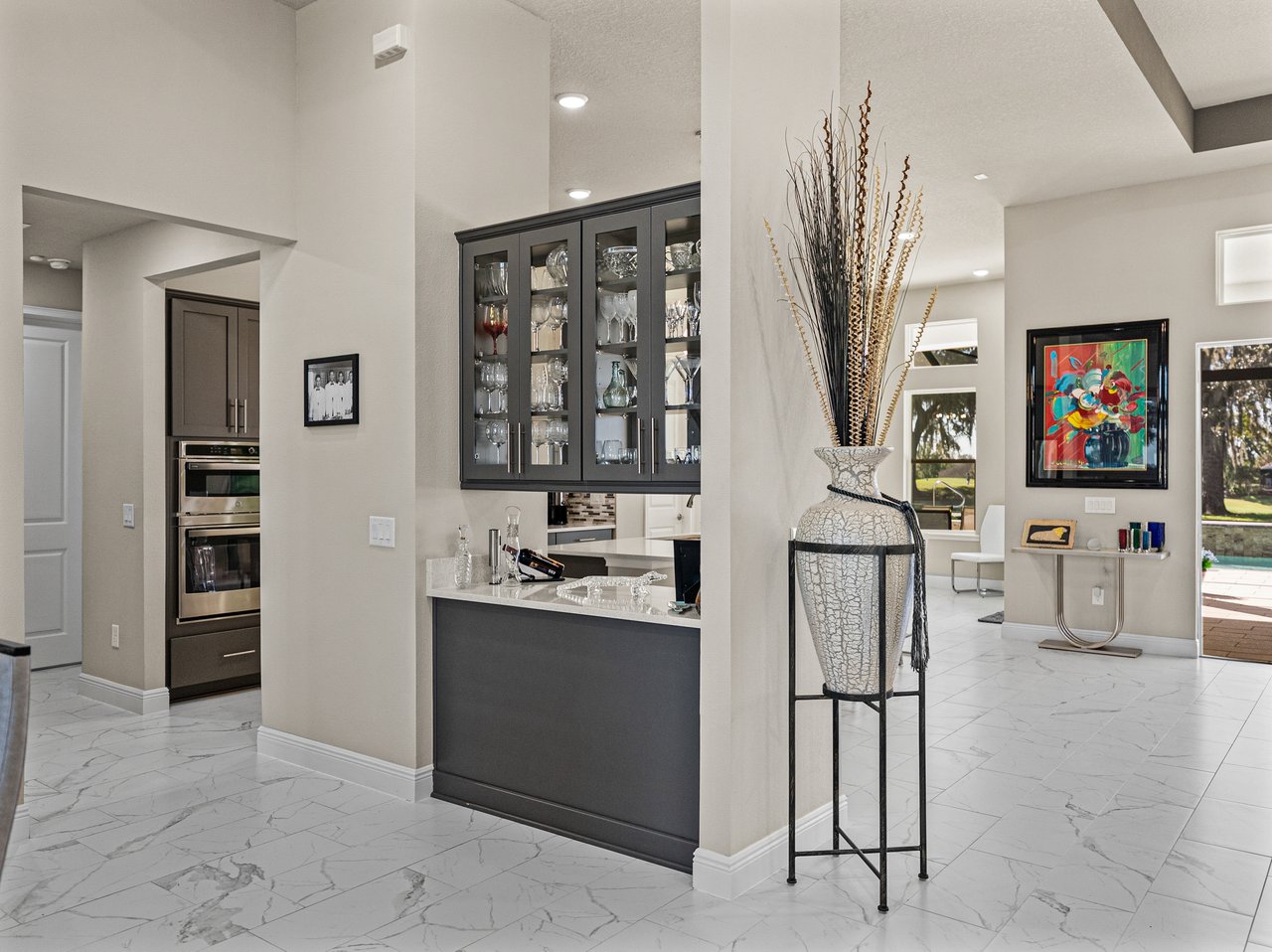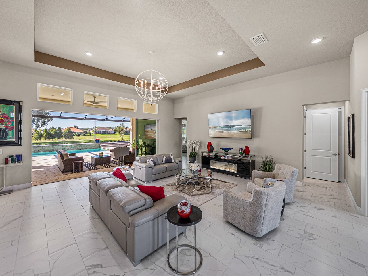 This exceptional new listing in Lake Jovita truly embodies luxury Florida living. This newly built, 3,174 sq ft pool home is situated on nearly half an acre with stunning golf course views, offering three bedrooms plus an office, and 3.5 baths. The curb appeal is meticulously designed with manicured landscaping, a paver driveway, and an oversized three-car garage. Over $250,000 in upgrades have transformed the backyard into a private oasis. Step inside to discover a residence where quality craftsmanship meets modern elegance. Twelve-foot ceilings create dramatic volume, complemented by porcelain tile flooring, upscale light fixtures, and plantation shutters throughout. The open and airy layout features quad sliding glass doors that lead to a high-end Shellock pool deck, seamlessly blending indoor and outdoor entertaining.The heart of the home is a stunning and functional kitchen, complete with quartz countertops, an island with seating for four, stainless steel appliances (including a gas cooktop and built-in oven), a hidden walk-in pantry, and a custom pass-through bar with a wine refrigerator that connects to the dedicated dining room. An office or additional living room provides an ideal workspace, while the primary suite offers a lavish retreat with two walk-in closets and a spa-inspired bath featuring a freestanding soaking tub and walk-in shower. Two guest suites, located on the opposite side of the home, each include a private full bathroom and walk-in closets, with one offering convenient pool access. The outdoor living space is equally impressive, featuring a screened lanai with Shellock pavers, a covered seating area overlooking the golf course, and a fully equipped outdoor kitchen with a grill, wet bar, refrigerator, and bar seating. The heated saltwater pool and spa, complete with Pentair equipment, provide the perfect escape from the Florida sun. Lake Jovita's resort-style amenities further enhance the experience, with optional access to two championship golf courses, a clubhouse, tennis and pickleball courts, dog parks, a fitness center, and scenic walking trails. I invite you to take the first step toward the Lake Jovita lifestyle by calling today to schedule a personal tour of this extraordinary home.