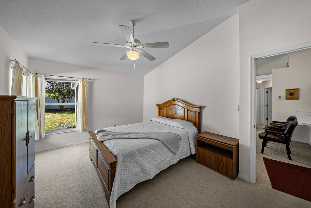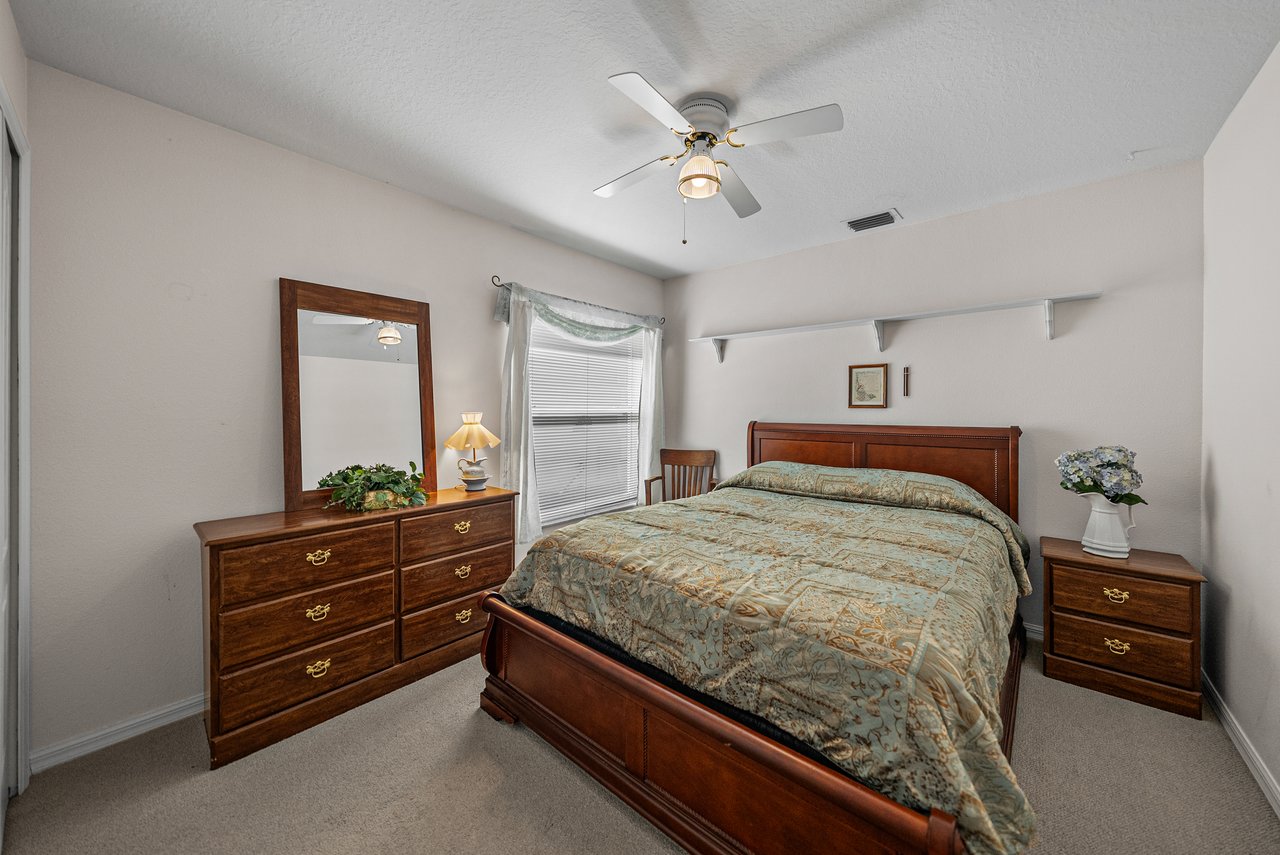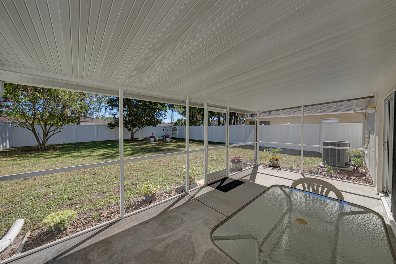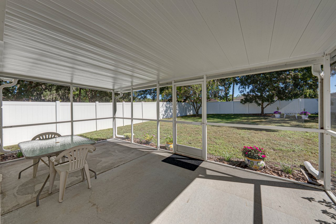 home's second full bathroom nearby. Peaceful Florida living awaits outdoors, where the screened