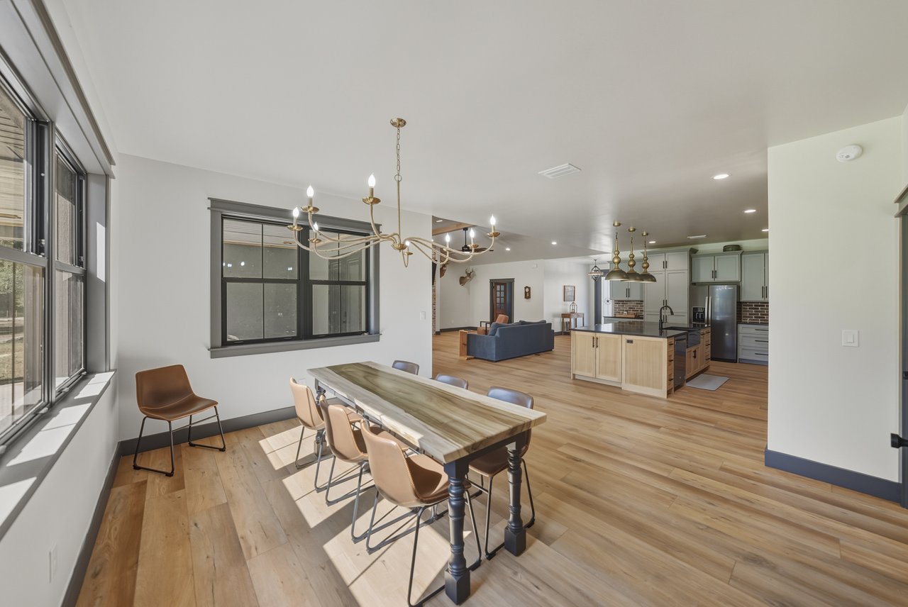 perfectly suits the space. A full size dining area opens seamlessly to the living room and kitchen