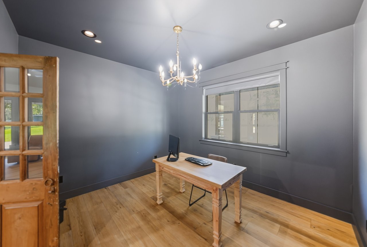 for an inviting entertainment experience. The office sits behind vintage wood doors, and a nearby