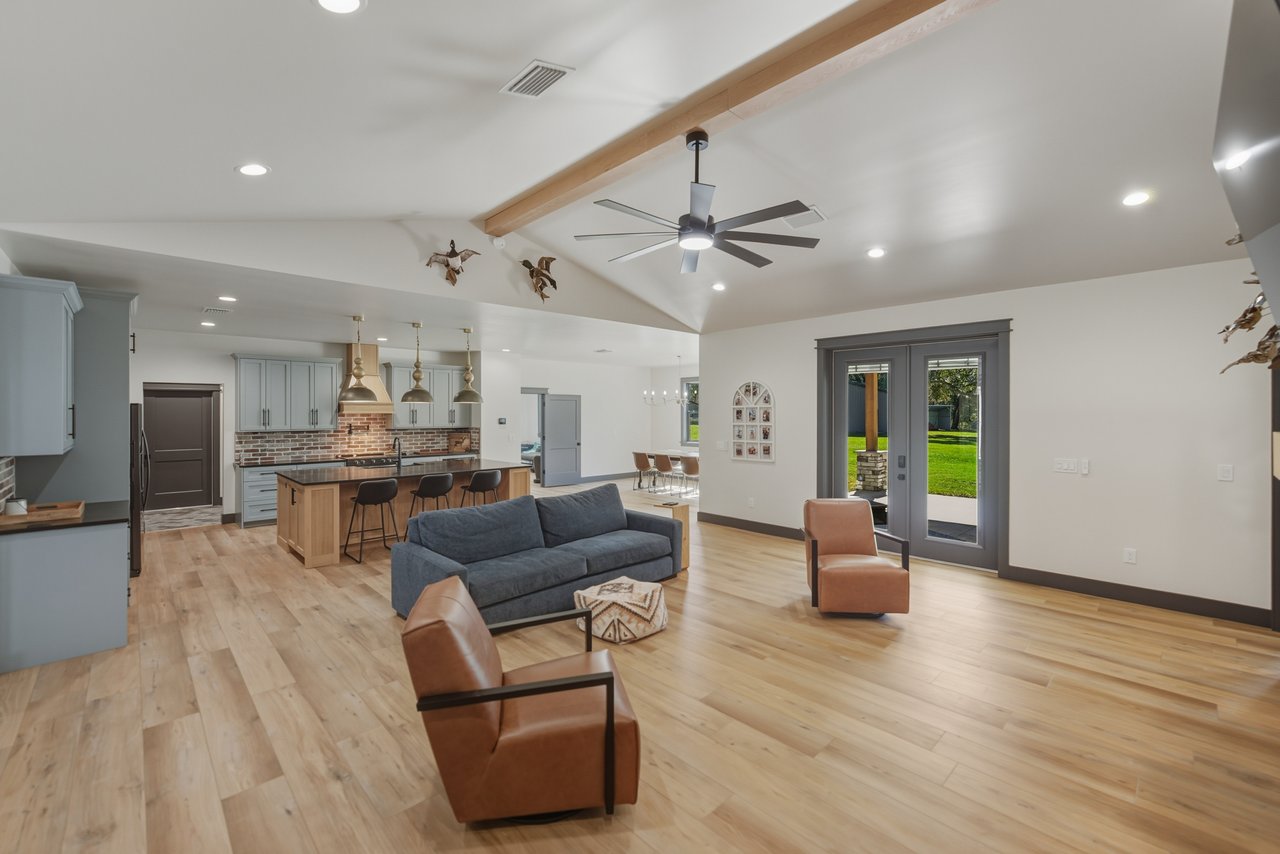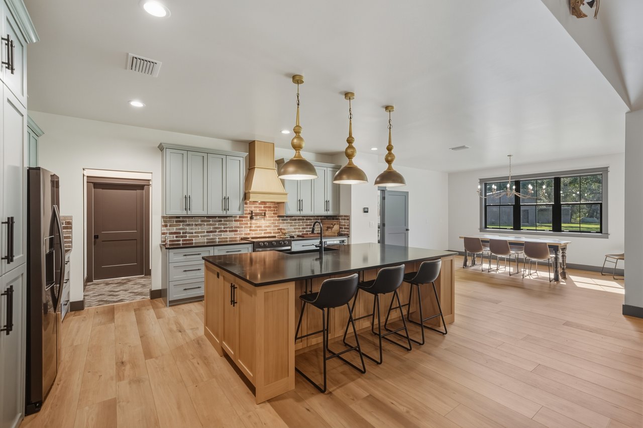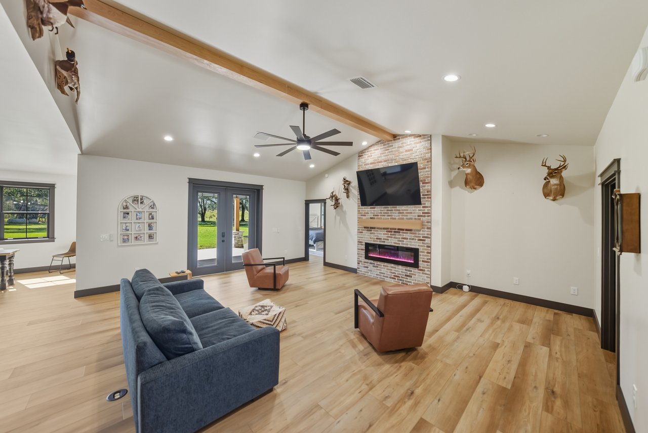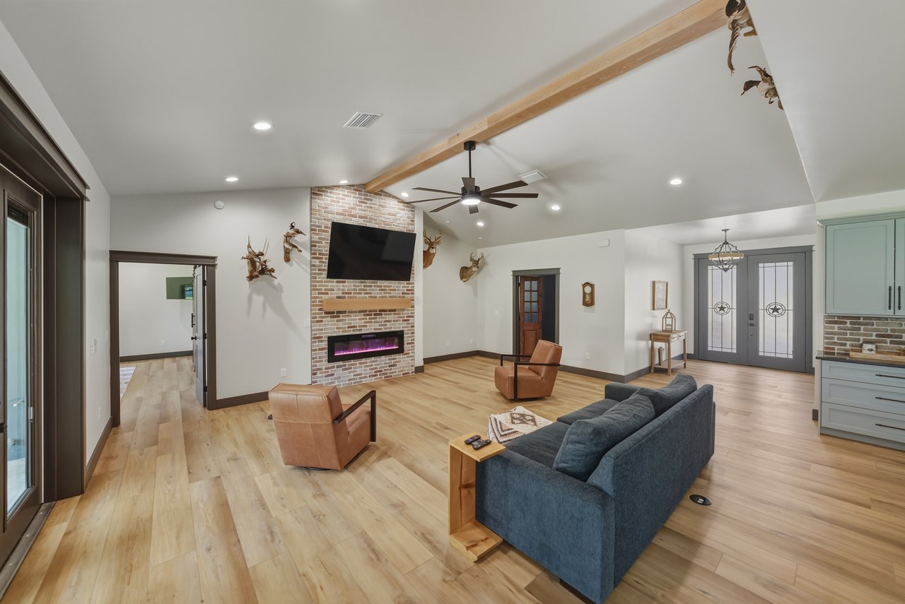elegant electric fireplace. The kitchen is a masterpiece of modern farmhouse aesthetic, with two
