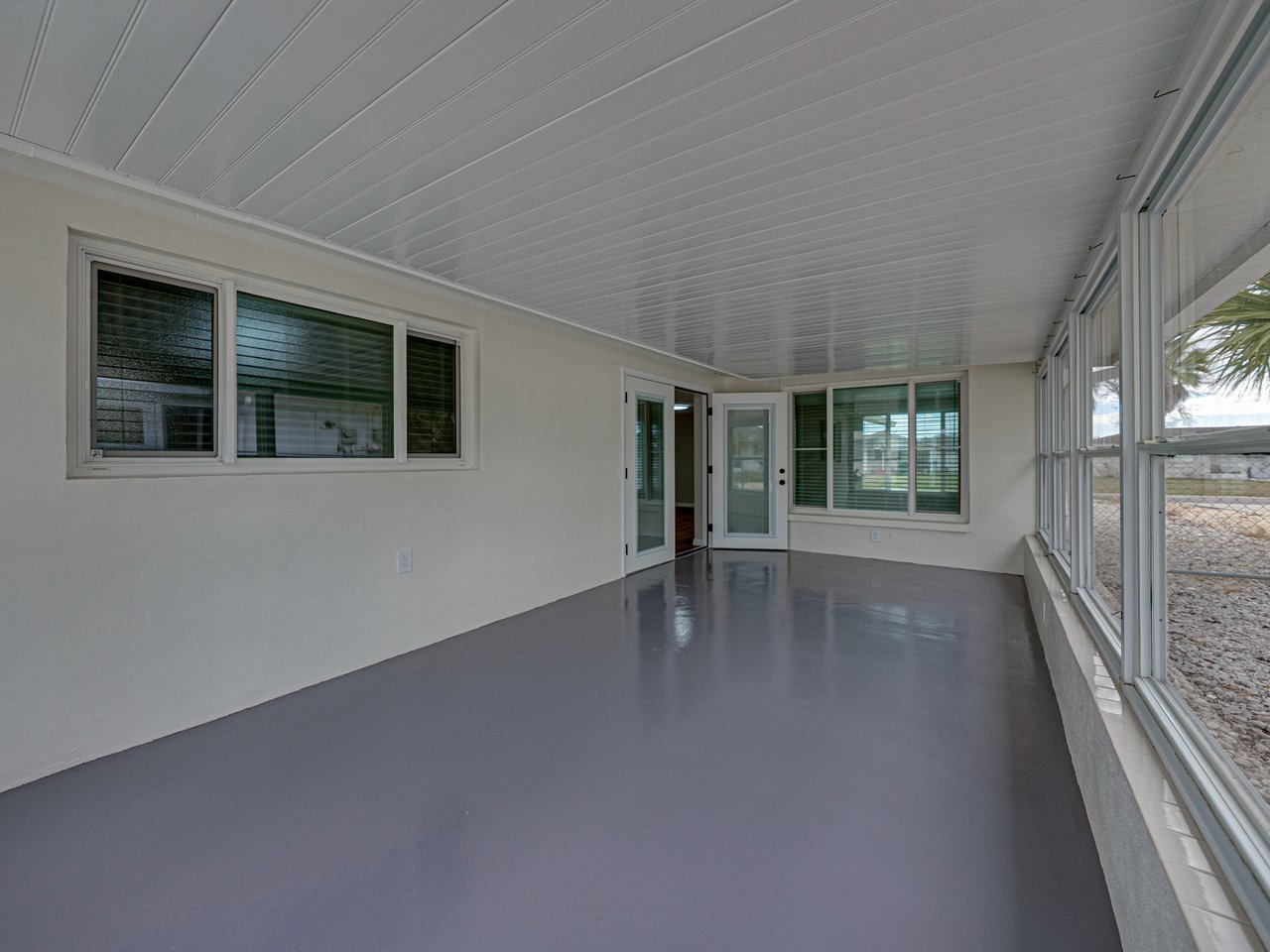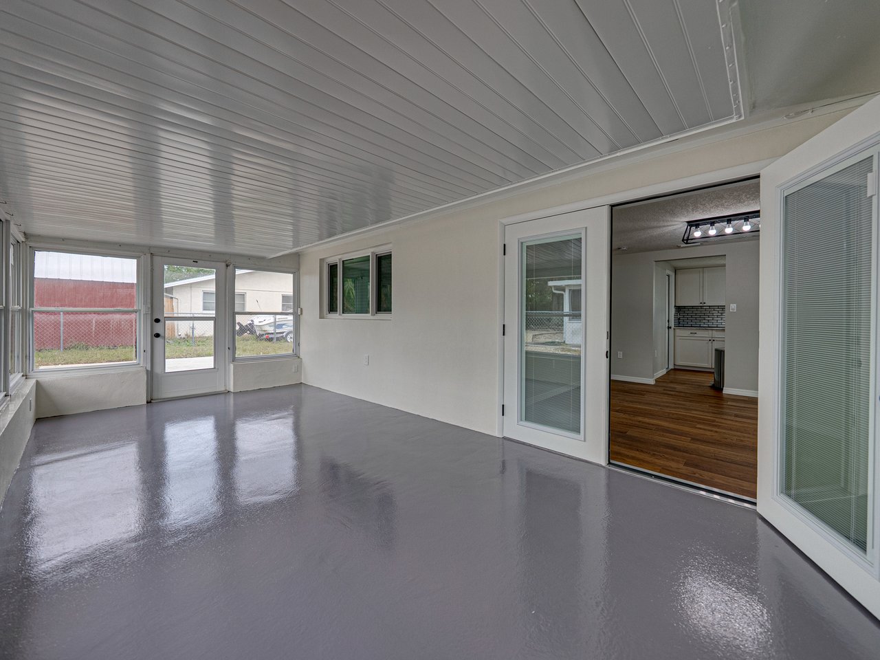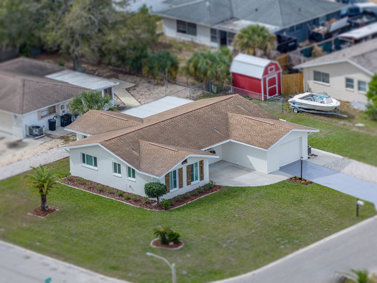 A picture perfect corner lot in the heart of Port Richey, this completely refreshed 3 bedroom, 2 bath, 1 car garage home delivers modern style and exceptional living from top to bottom. The curb appeal captivates with a freshly painted exterior, new landscaping and lighting, and added parking pads for extra guest parking, a boat or RV. Every major component has been updated since 2017, including the roof, AC, water heater, and windows, while the full interior transformation was completed in 2025. Step inside to find all-new luxury vinyl plank flooring, interior paint, doors, hardware, lighting, and beautifully redone bathrooms and kitchen. This kitchen is an absolute standout, featuring brand new stainless steel appliances, soft-close cabinetry, granite countertops, a decorative backsplash, and matte black hardware and lighting for a designer finish. With its easy access to both the pantry and garage, unloading groceries couldn't be simpler. Natural light fills the main living areas, where the living room flows seamlessly into the dining room, accented by a modern chandelier and French doors that open to the sunroom, creating the ultimate entertainer's layout with a polished, cohesive style that shines from room to room. The primary suite is privately tucked away and provides a large walk-in closet and a completely redone ensuite bathroom, both highlighted by trendy barn doors. The ensuite showcases a new modern rustic vanity, new toilet, updated flooring, and a walk-in shower with decorative subway tile detailing. Two comfortable guest bedrooms are located on the other side of the home, each offering new lighting, flooring, closet doors, and shelving. They share a fully renovated bathroom with a new oversized vanity, new toilet, and a fresh tub/shower combo accented by decorative blue tile that adds a perfect pop of color. Enjoy Florida living at its finest with multiple outdoor spaces to relax and unwind, an attached enclosed porch ideal for morning coffee, and an open patio ready for a tranquil fire pit setup. Beautifully finished epoxy floors in both the garage and sunroom add durability and a clean crisp look- even the driveway has been refreshed, creating a truly turnkey home from start to finish! Completely move-in ready and close to shopping, dining, and entertainment, this home is waiting for its newest owner. Don't miss your chance to make it yours, schedule your showing today and fall in love with this stunning Port Richey retreat!