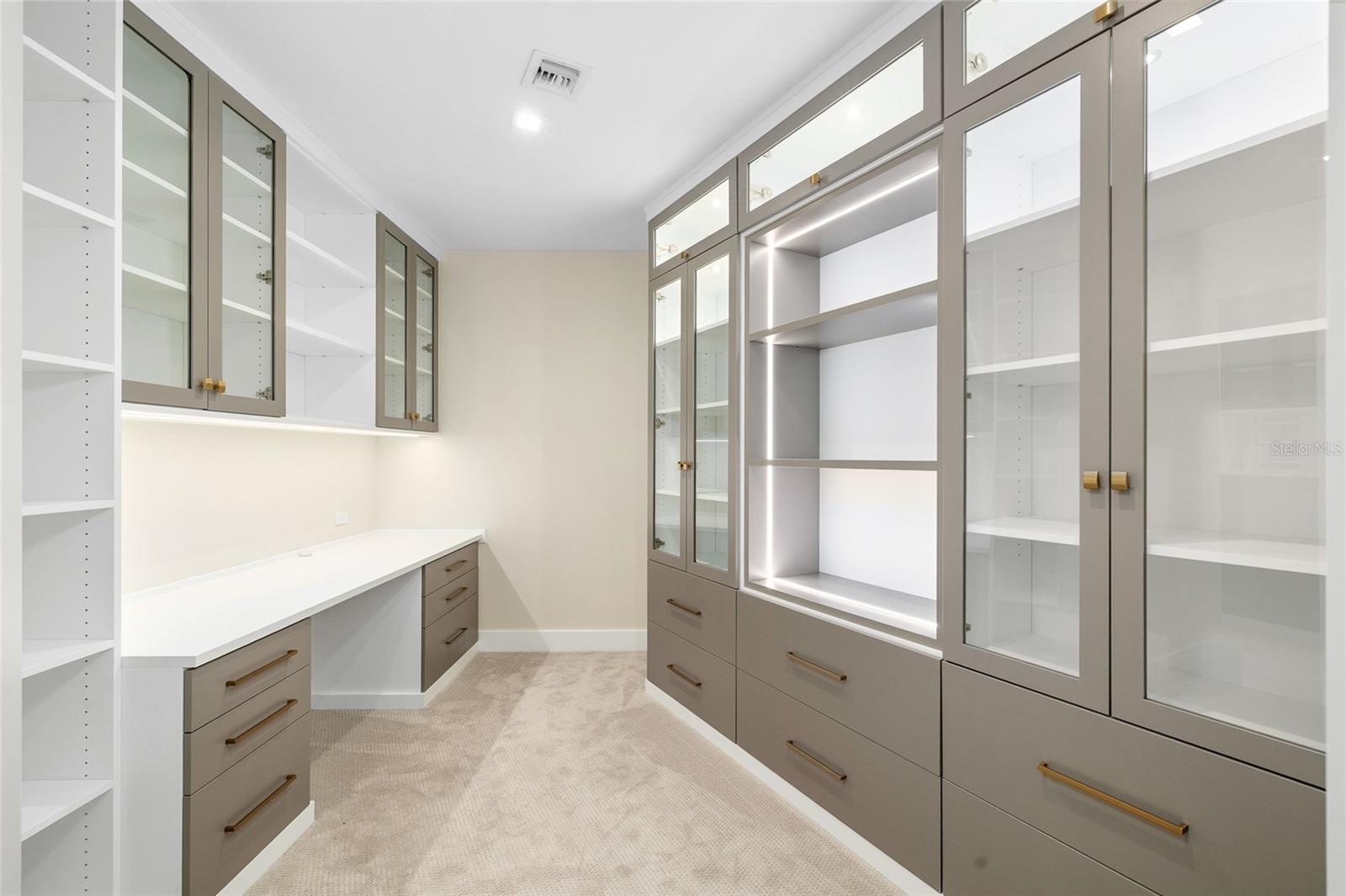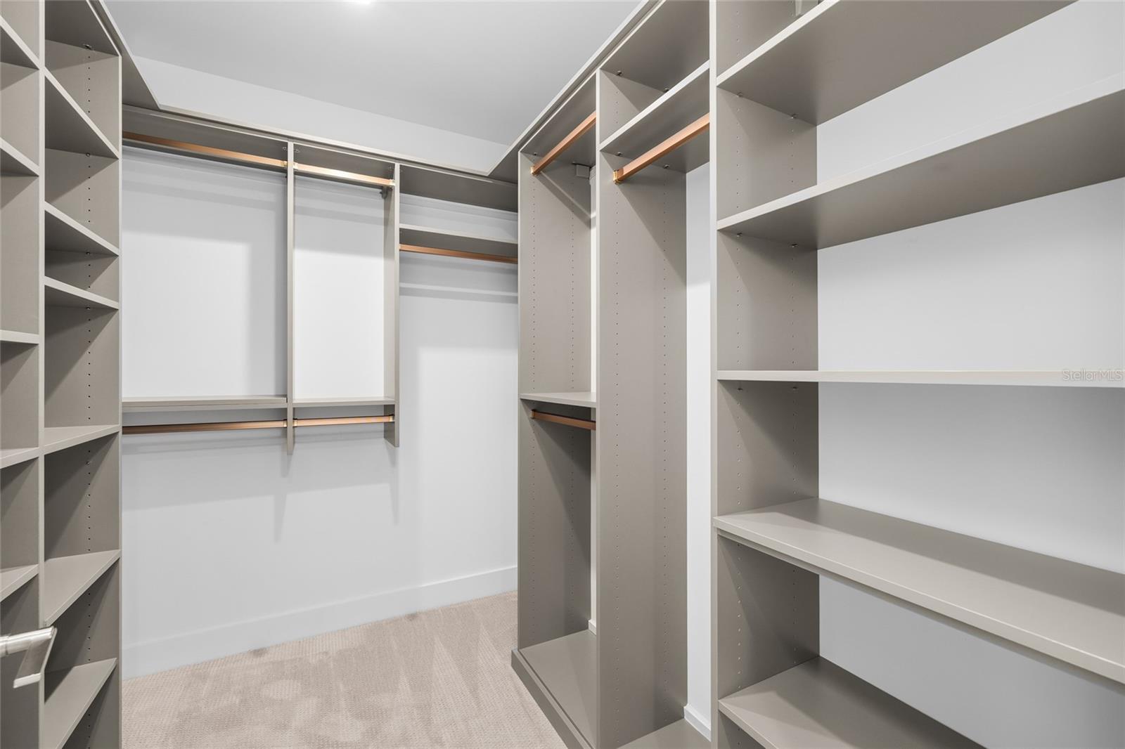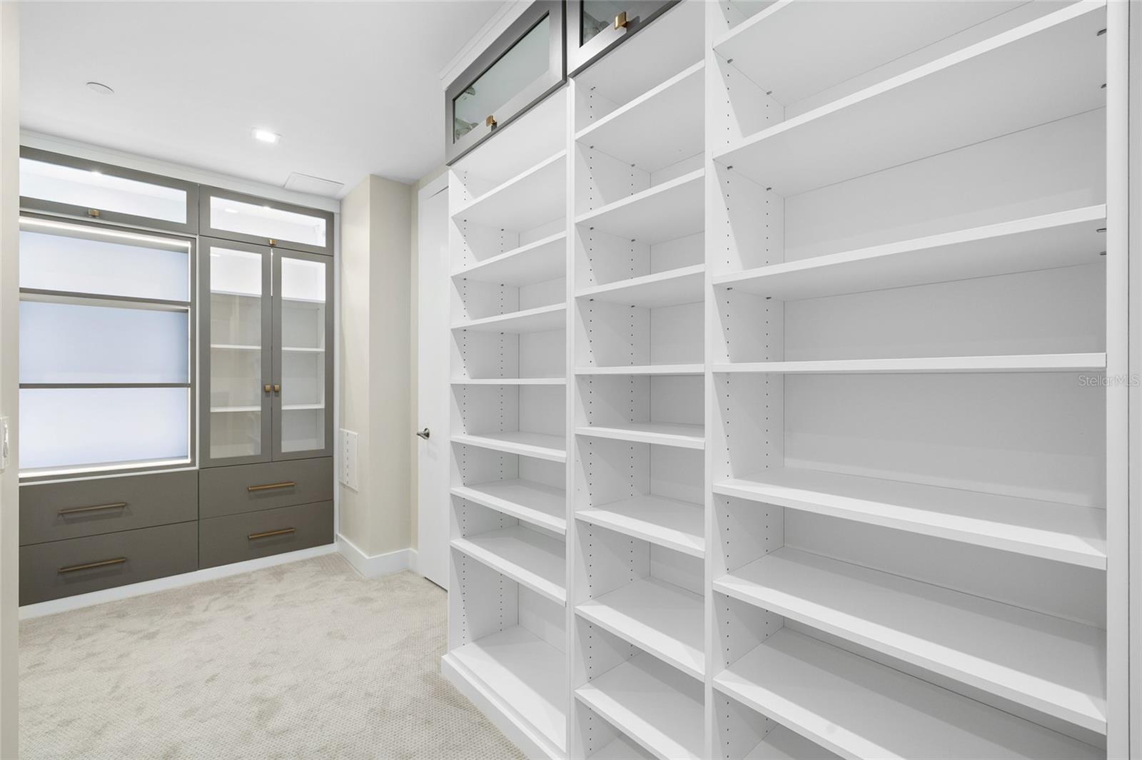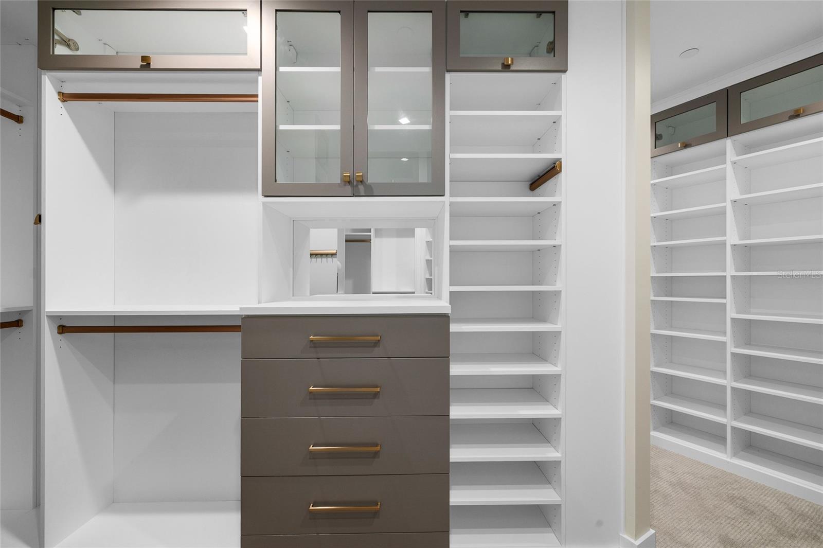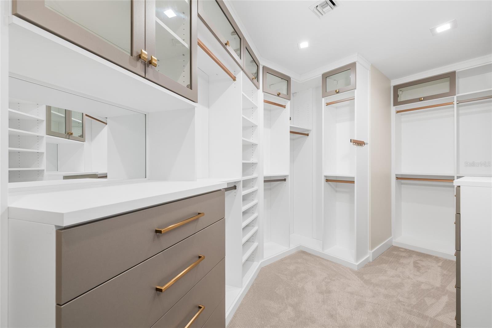 wallpaper feature wall, and a massive walk-in closet outfitted with California Closets, including