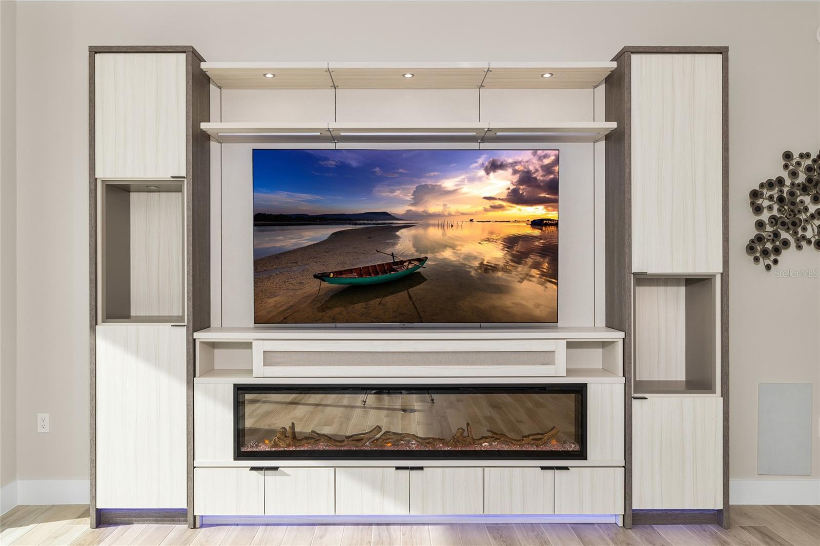 room where a sleek entertainment center and built-in electric fireplace set a modern yet inviting