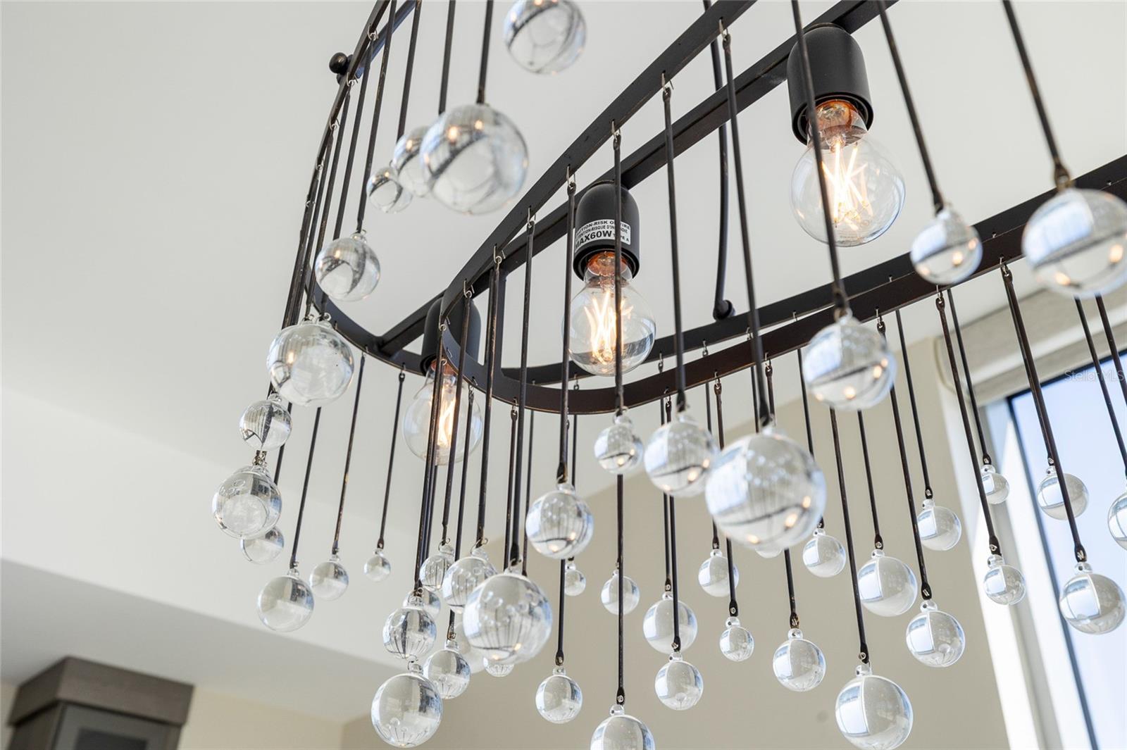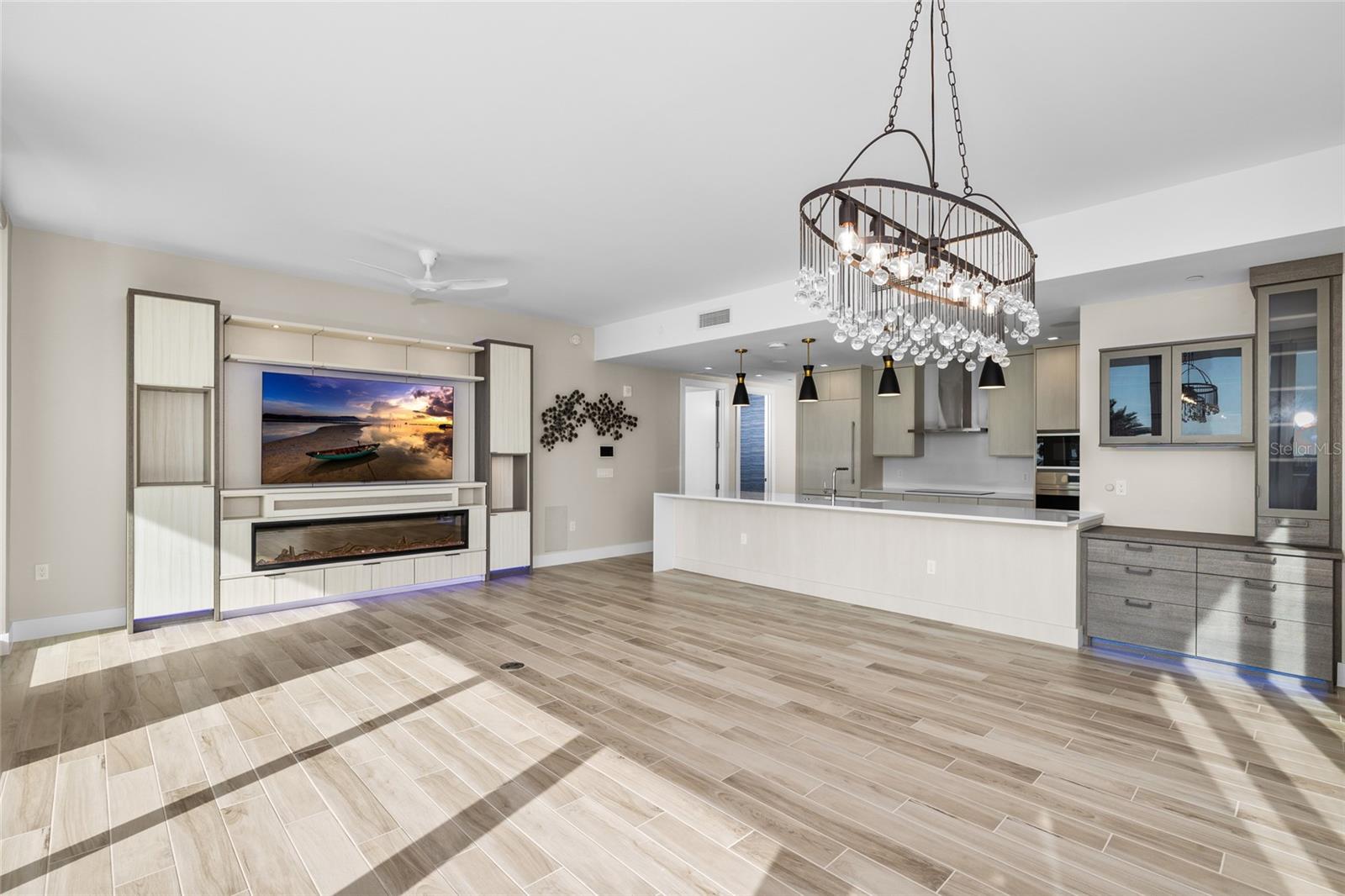 complete with a statement chandelier and custom coffee bar, flows effortlessly into the living