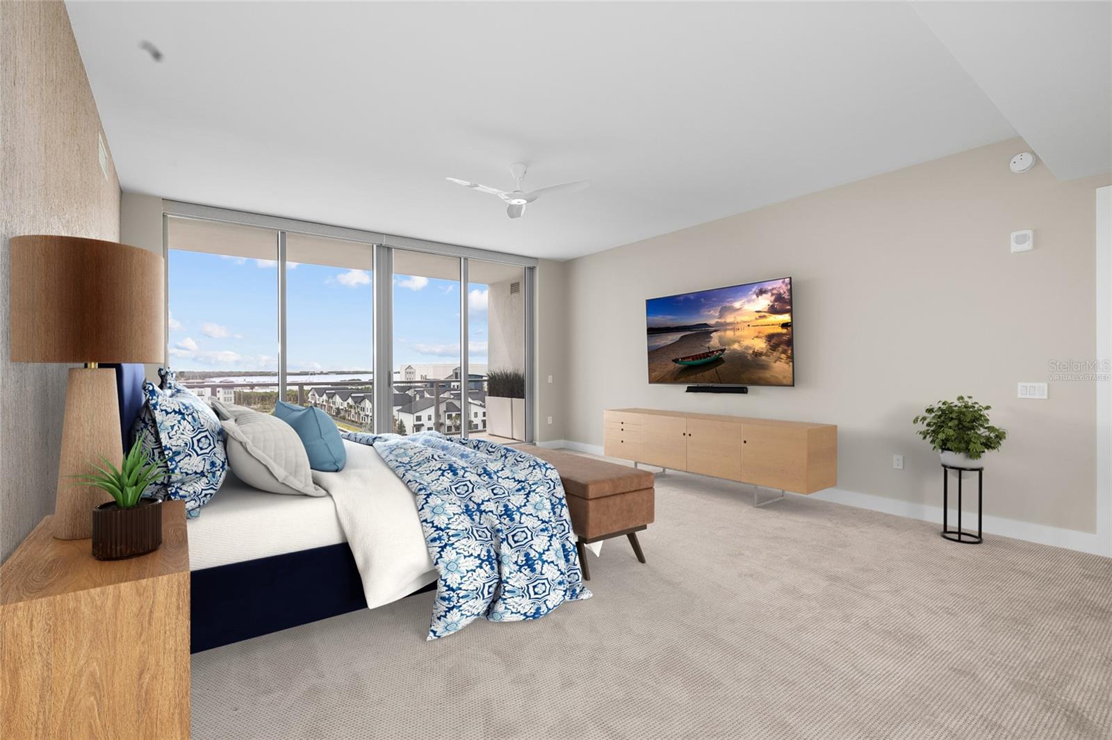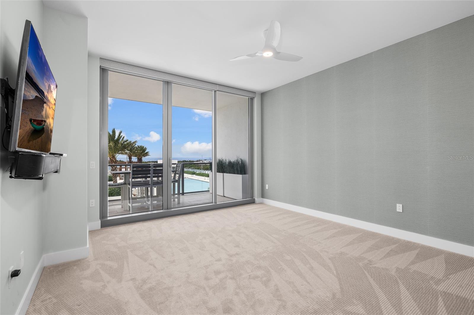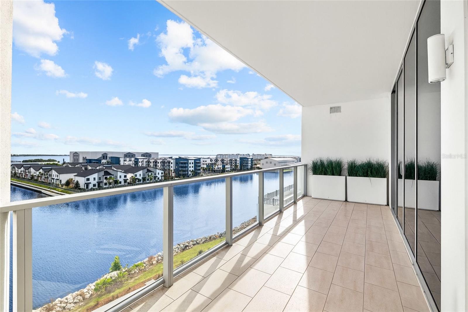 hurricane-rated windows. A private balcony extends the living space outdoors, while wood-look
