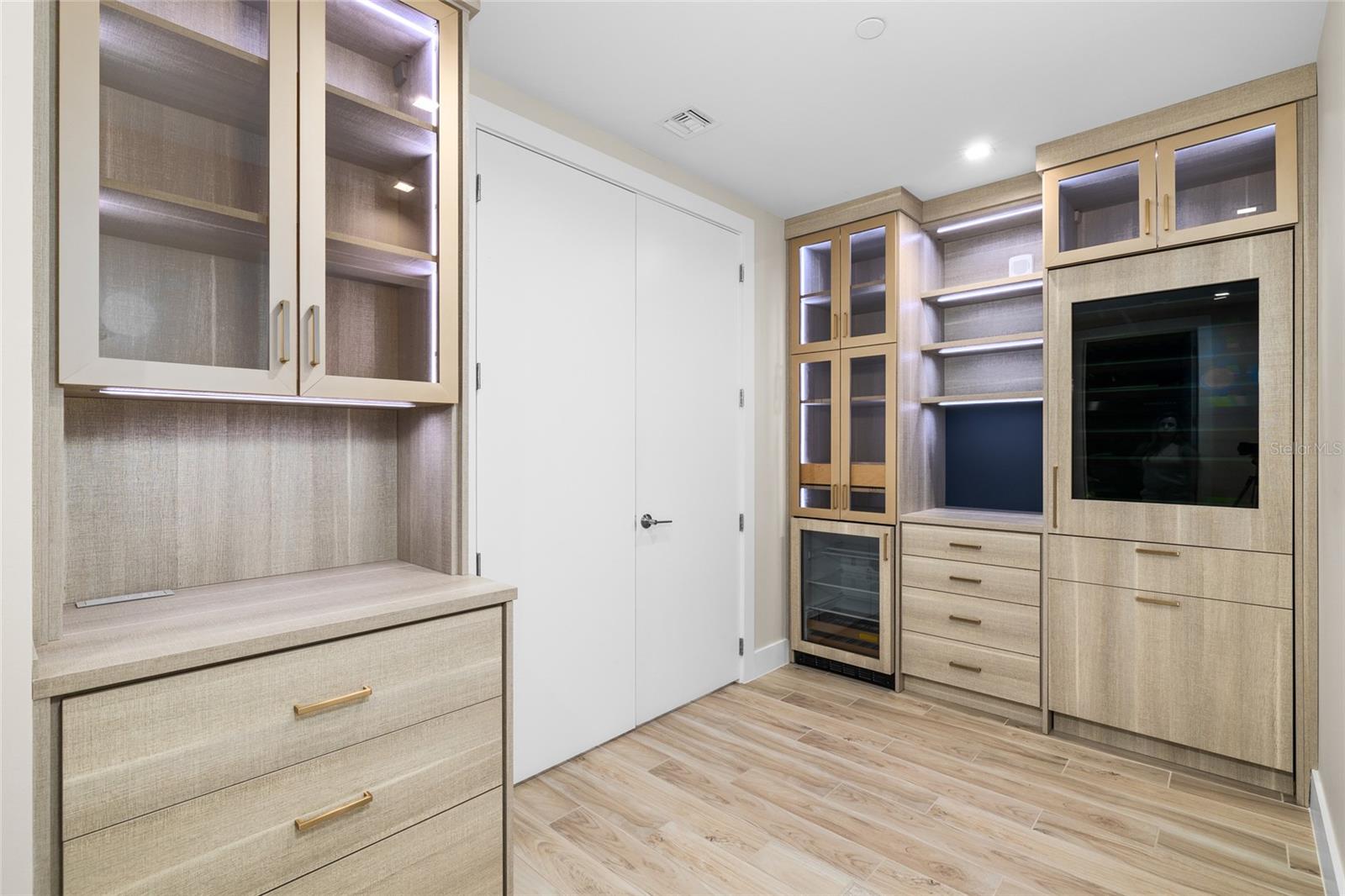 storage and a built-in serving area featuring a Monogram wine fridge, beverage fridge, and ice