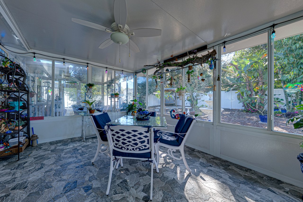 with double pane windows, a ceiling fan, and stone tile flooring that invites year-round