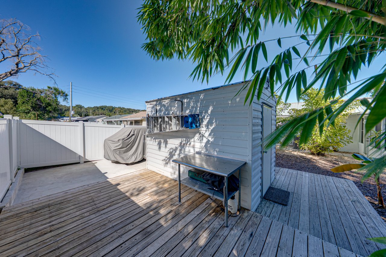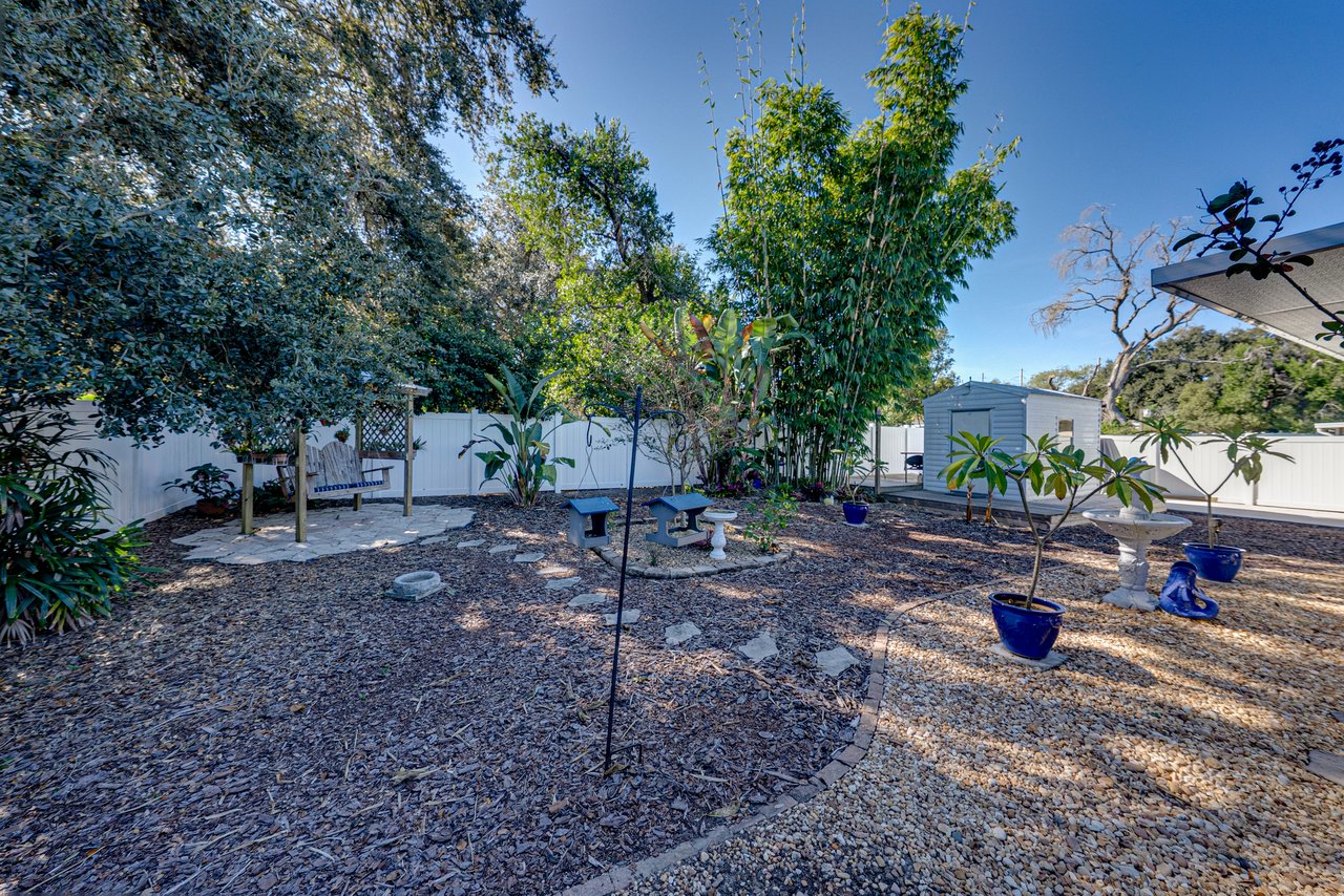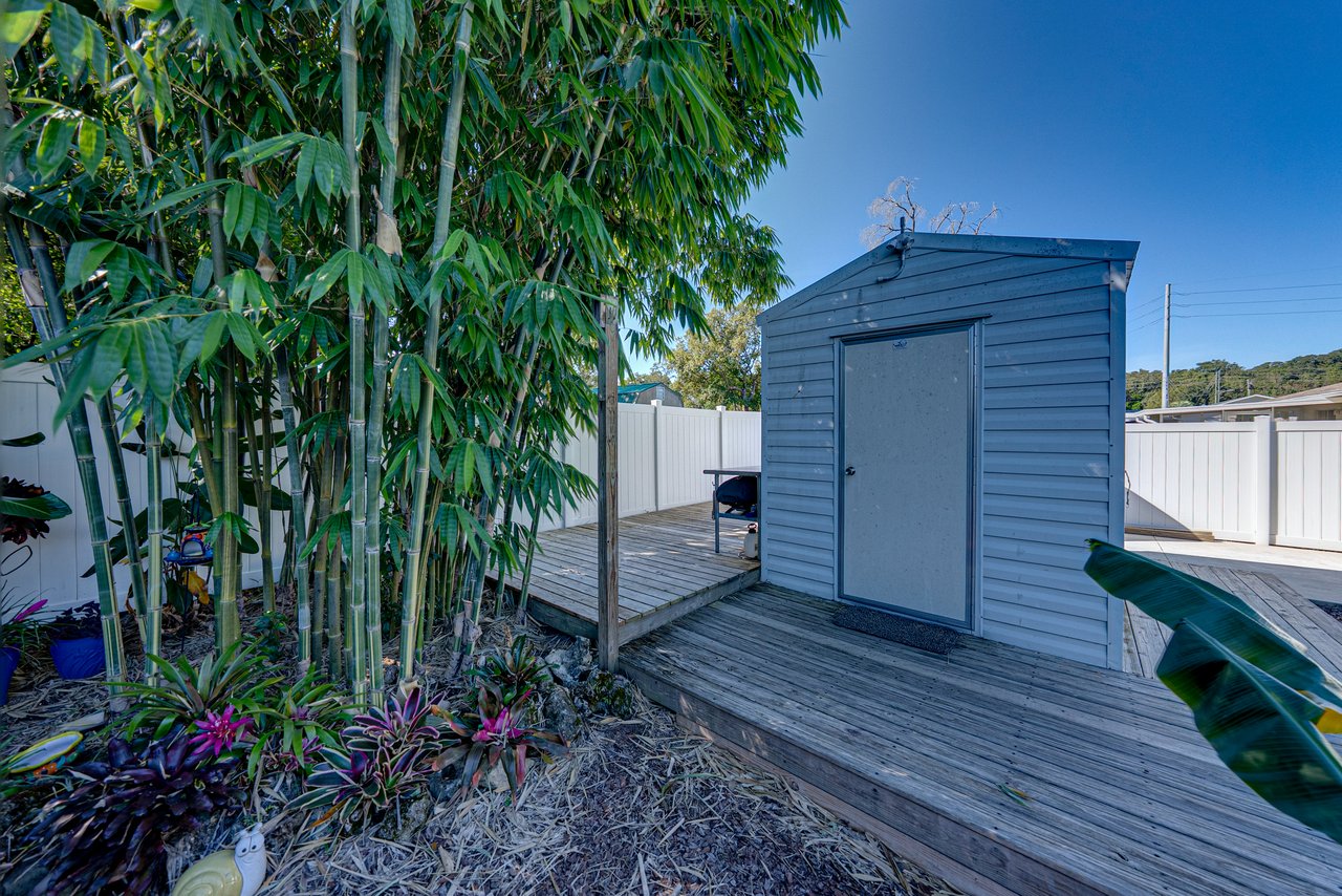its relaxing swing, deck around the shed, and tall clumping bamboo that adds greenery without