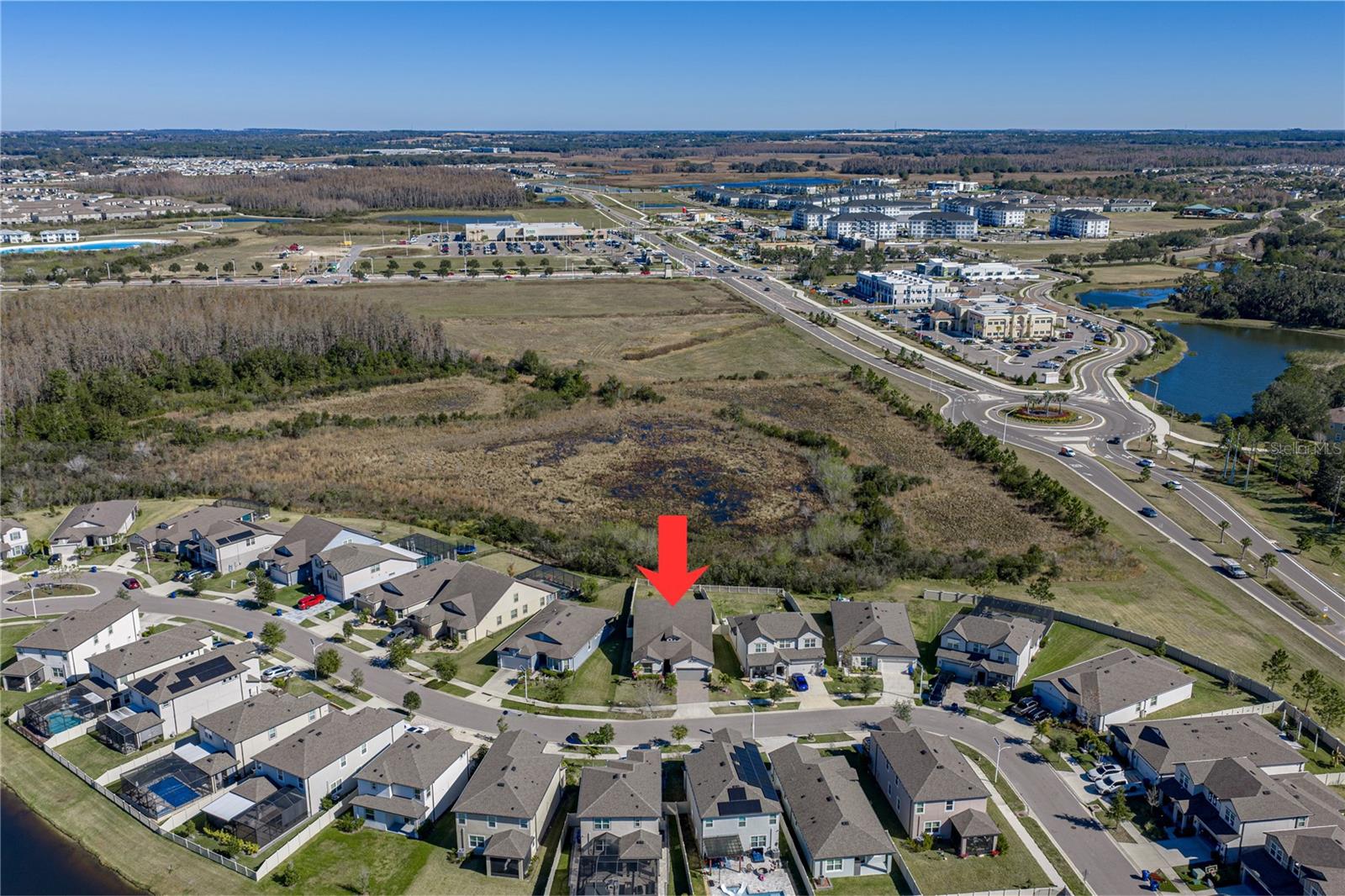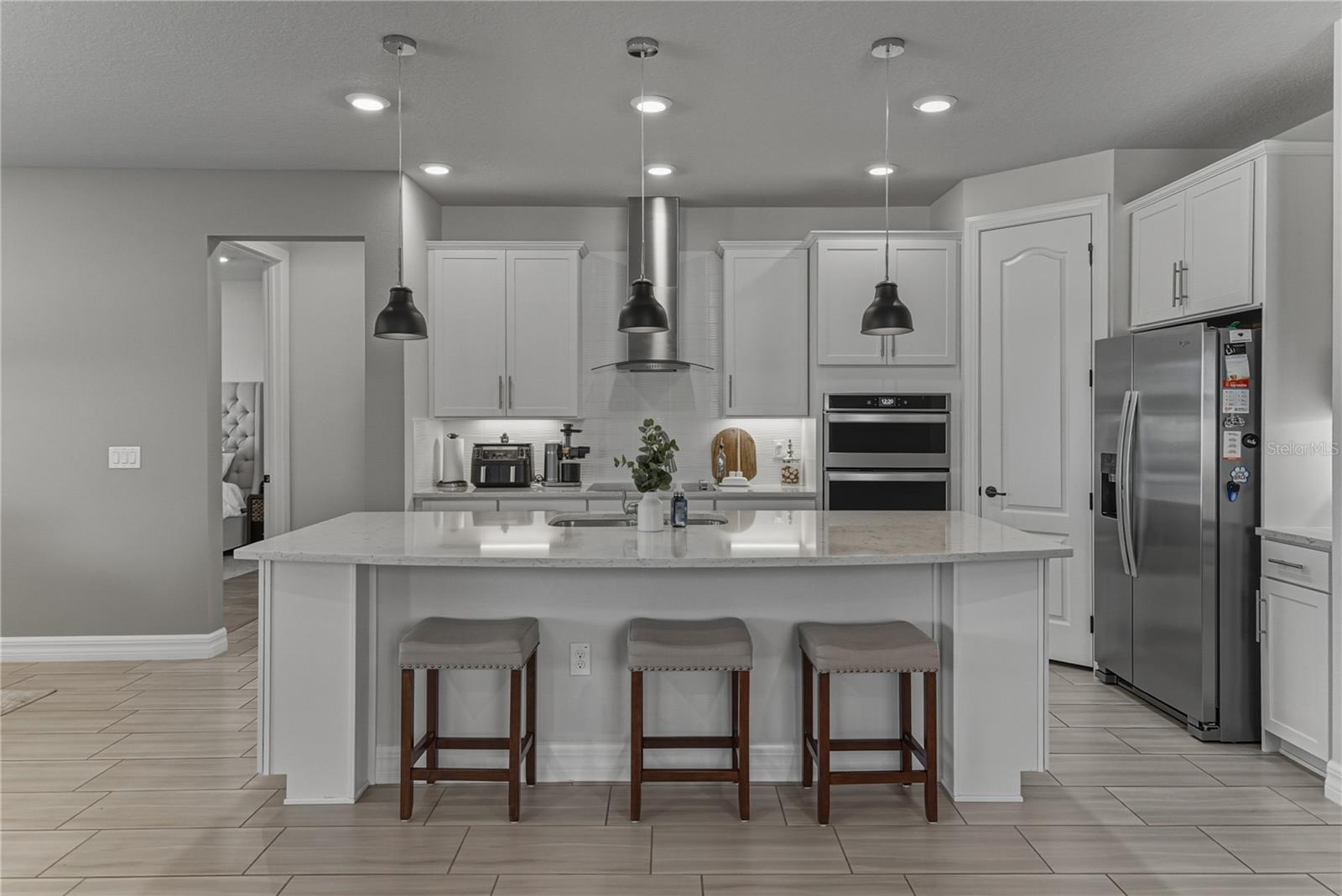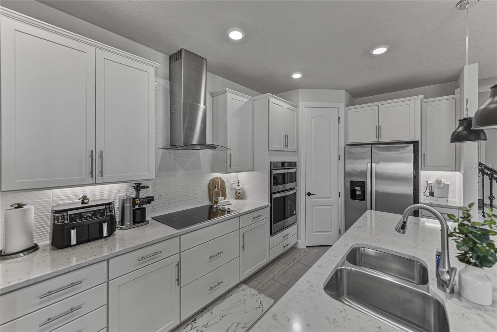 Wake up every day to the feeling of living on vacation in the Epperson Lagoon community, home to the country's first crystal-clear lagoon and one of Wesley Chapel's most exciting lifestyles. Set on a premium conservation lot with no rear neighbors, this 2020 built, 2 story, 3 bedroom + office, 3 bath home with loft and a tandem 3 car garage pairs thoughtful upgrades with easy, resort-style living. Curb appeal is immediate with a paver driveway, palm-lined landscaping, and a welcoming entry. Inside, natural light fills the open living spaces thanks to the home's ideal orientation, highlighting 8' interior doors, upgraded trim, and clean, modern finishes throughout. A private office behind glass French doors offers a polished workspace that feels tucked away yet connected. The kitchen anchors the home with an upgraded layout designed for entertaining and effortless everyday cooking. A built-in smart wall oven with guided cooking, a separate cooktop with designer hood, a cabinet-integrated microwave, a refrigerator surrounded with cabinetry, an upgraded tile backsplash, and extra pull-out storage keep the space functional and visually refined. The living and dining areas flow effortlessly around it, creating a comfortable setting for gatherings large or small. Indoor/outdoor living becomes a reality when the triple stacking sliding doors open to the newly screened back porch revealing the stunning private view. The primary suite is privately positioned and sunlit, offering a true retreat with a walk-in closet and an ensuite bath that features a garden soaking tub, walk-in shower with rainfall head and handheld wand, designer tile, and comfort-height cabinets that elevate the daily routine. Also on the first floor is a spacious guest bedroom near the home's second full bathroom, and an elevated laundry room with cabinetry, a utility sink, a pull down spray faucet, and a storage closet. Stroll up the staircase to an incredibly flexible loft that presents to opportunity for a media room, playroom, or second living area. A generously sized third bedroom and a third full bathroom is also upstairs creating a truly separate guest retreat. Peaceful Florida living awaits outdoors. The screened lanai is finished with no-see-um mesh and overlooks a fully fenced backyard backing to conservation, offering privacy, tranquil views, and space to unwind. Updated landscaping, garden lighting, and mature palms complete the setting. Additional highlights include Nest thermostats on both levels, keyless entry, video doorbell and security cameras, a tandem garage bay ideal for a golf cart or extra storage, and plumbing in place for a water softener system. Beyond the home, Epperson delivers a lifestyle unlike any other, centered around its iconic lagoon with sandy beaches, water activities, events, and a true community feel. Everyday conveniences including Publix, dining, medical offices, schools, and more are just minutes away. This is more than a home, it's a lifestyle upgrade. Schedule your private showing and experience it for yourself.