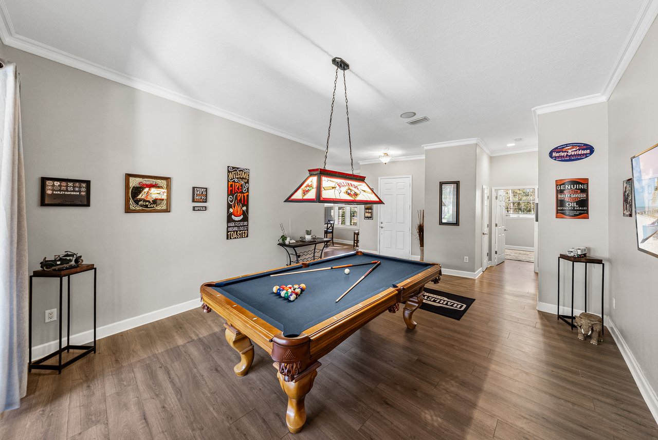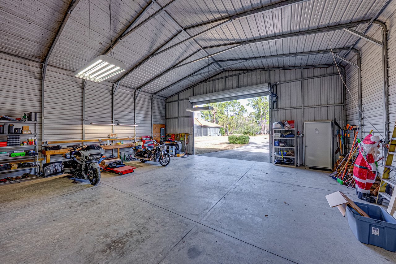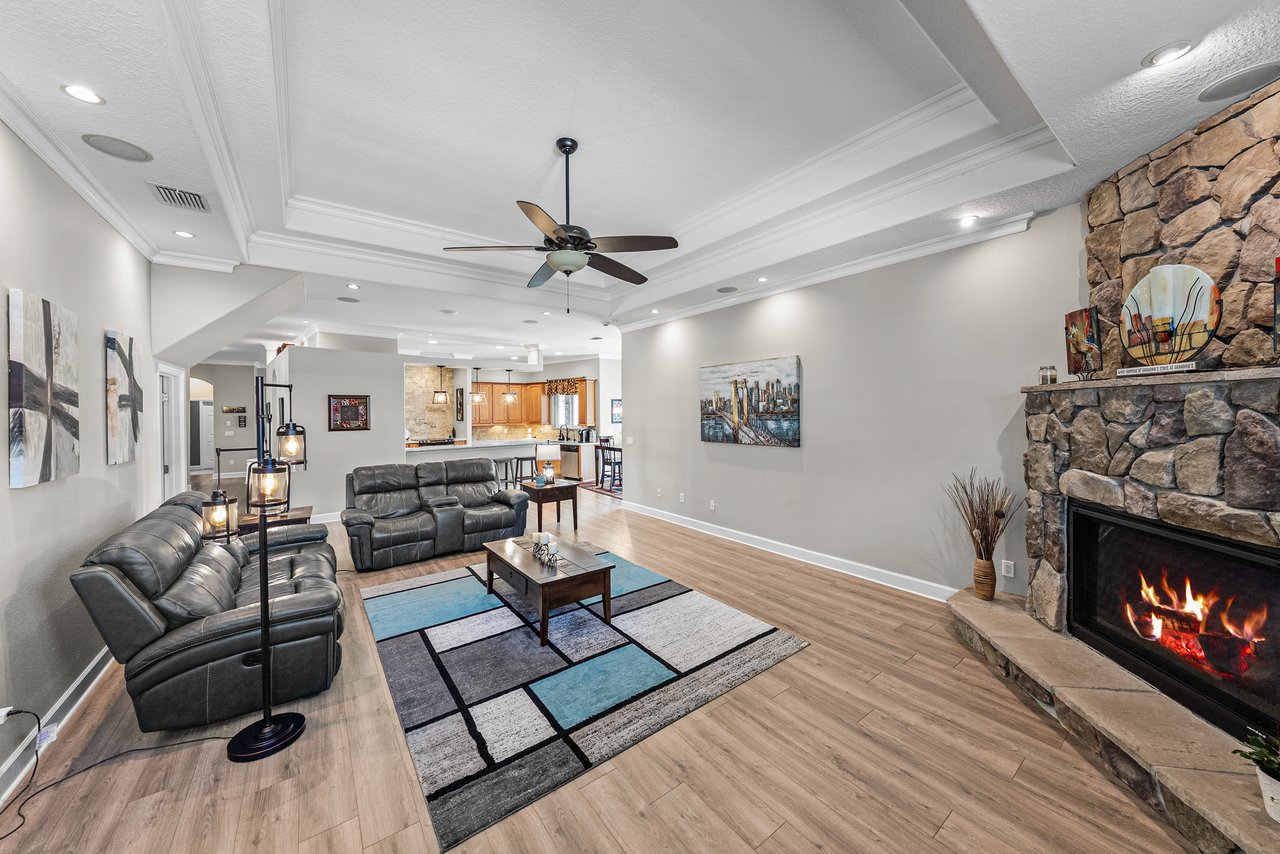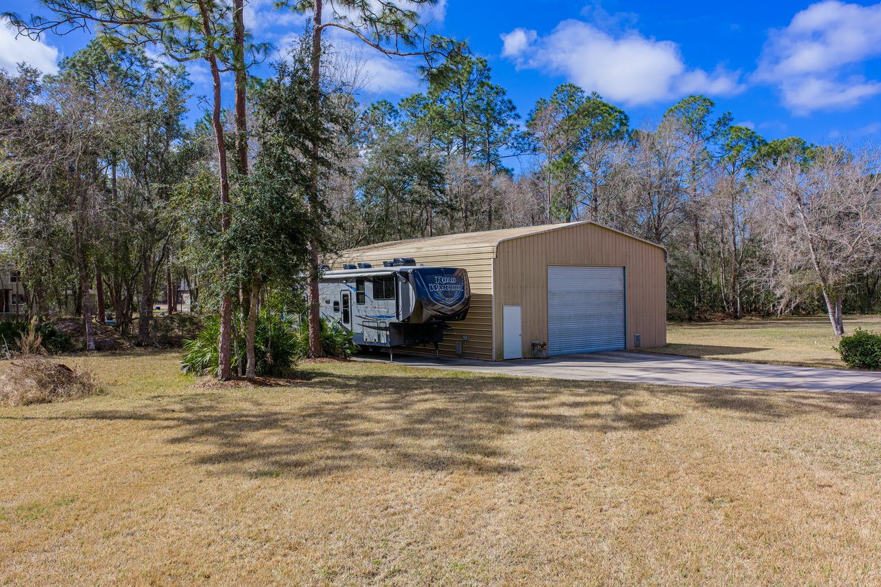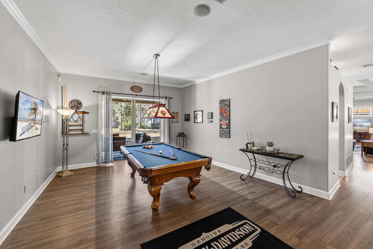 There's a certain ease to life when you have room to live it, and this Wesley Chapel 4 bedroom, 3.5 bath, 2 story home set on a full acre of land delivers that rare sense of openness from the moment you arrive. Shaded by mature trees and paired with an extended driveway, welcoming front porch, and a 2024 roof, the property sets the tone for a home designed to live big both inside and out. It offers not one but two major garage spaces: an attached 3 car garage plus an impressive 35' x 50' detached metal building with a 12' x 16' motorized door and lofted storage. Whether you collect cars, run a workshop, or simply crave room to create, it's all right here. Inside, a flexible, sprawling layout unfolds across the main level. The family room sets a warm tone with its stone-accented gas fireplace, tray ceilings, crown molding, luxury vinyl plank flooring, and seamless connection to the gourmet kitchen and dinette. The kitchen stands out as the centerpiece, an expansive culinary space with abundant cabinet storage, quartz countertops, breakfast bar seating under pendant lighting, a walk-in pantry, stainless steel appliances, a pot filler above the range, a reverse osmosis system at the sink, and an inviting eat-in dinette. Whether hosting gatherings or enjoying laid-back mornings, the setup creates effortless functionality wrapped in luxury. More intimate spaces sit nearby, including a formal dining room and a formal living room currently used as a game room, complete with a pool table that stays with the home. Multiple sliding glass doors in these spaces recess completely and open to the screened back porch, creating a true indoor/outdoor flow. Flexibility continues upstairs, where a 675 sq ft loft spans the entire second floor. With its own full bathroom, plush carpeting, and temperature-controlled storage room, the space is ideal for a second primary suite, media retreat, or multi-generational living. All traditional bedrooms remain on the first floor in a thoughtful split plan. The primary suite offers generous proportions, plush carpet flooring, sliding doors to the screened porch, dual walk-in closets, and a peaceful ensuite bathroom featuring a walk-in shower, jetted bathtub, water closet, and dual sinks with granite countertops plus a dedicated vanity seat. Nearby, a second bedroom works beautifully as an office or nursery with easy access to the guest half bath. Across the home, bedrooms three and four each include plush carpeting, large walk-in closets, and close proximity to the home's third full bath. Every detail has been meticulously curated- from the surround sound system with speakers and individual volume controls in every room to crown molding, stone counters, upgraded flooring, and that incredible indoor/outdoor connection created by fully recessing sliders. Step outside to a screened porch overlooking a spacious yard with mature trees, a peaceful rural feel, and the expansive detached garage complete with a workbench and lofted storage. This stunning residence sits moments from local hotspots including The Krate, The Grove, Target, Tampa Premium Outlets, medical facilities including the soon-to-open Johns Hopkins Children's Hospital, local restaurants, major highways for commuter convenience, and zoning for Cypress Creek Middle and High School. Homes with this ideal blend of land, flexibility, upgrades, and location rarely come to market. Call today to experience this exceptional residence for yourself.