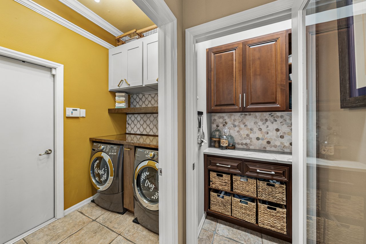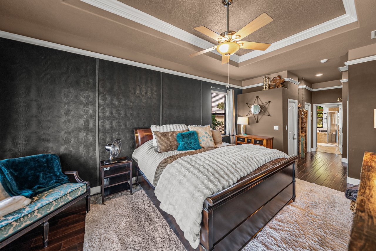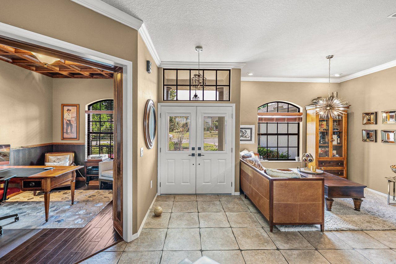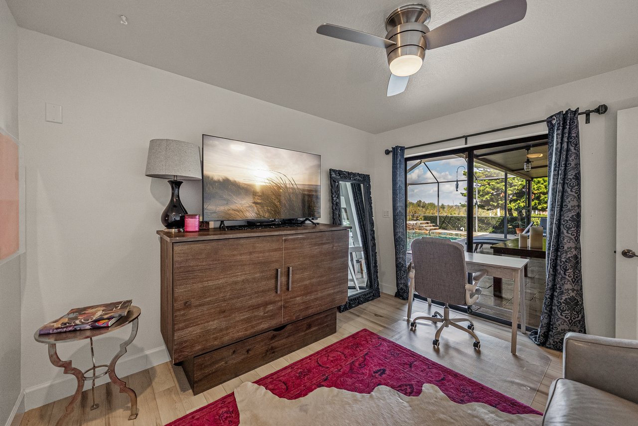 Gracefully positioned within the gates of Lake Jovita, this beautifully updated 4 bedroom + office, 2 bath pool home pairs stunning golf and water views with an inviting modern Tuscan vibe and exceptional craftsmanship throughout. Lush, manicured landscaping creates a welcoming first impression, complemented by a 2021 roof, a full outdoor kitchen, and a layout that flows effortlessly from one thoughtfully designed space to the next. The sweeping open floor plan showcases two flexible living areas, including a comfortable family room with a cozy fireplace, coffered ceiling, and triple sliding doors that frame the resort-style outdoor living space. At the heart of the home sits the completely reimagined chef’s kitchen, offering beautifully crafted wood cabinetry, quartzite countertops, a stone slab backsplash, upgraded ambient ceiling lighting, a propane cooktop, built-in oven and microwave, wine refrigerator, and a spacious island with breakfast bar seating. Every detail reflects quality, from the soft-close cabinetry and built-in drawer organizers to the pull-out toaster oven and pull-out coffee bar. An impressive walk-in pantry, finished with matching cabinetry, custom countertops, ambient lighting, and a pot hanger, elevates everyday functionality in the best possible way. Nearby, the custom laundry room adds even more convenience with a butcher block countertop designed to span the washer and dryer, custom cabinetry, a unique backsplash that cleverly conceals plumbing and electrical, and upgraded lighting for a refined finish. A dedicated executive office sits near the front of the home, offering a tranquil workspace enriched with custom wall cabinets, drawers, shelving, and a coffered ceiling. The private primary suite features upgraded wood flooring, lanai access, a spacious walk-in closet, and an ensuite bathroom with dual sinks, walk-in shower, soaking tub, and a water closet. Two guest bedrooms include custom-designed closets and stain-resistant carpet, while the luxury vinyl–finished fourth bedroom enjoys direct lanai access, providing an ideal flex space for a media room, game room, or private retreat. An entertainer’s paradise awaits outdoors where a custom-designed heated pool, upgraded finishes, and accent lighting set the stage for unforgettable gatherings. The travertine deck expands into generous covered seating areas and an impressive outdoor kitchen equipped with Alfresco propane appliances, stainless steel cabinetry, a granite bar with seating, built-in drink chest, and a handcrafted brick pizza oven made with iconic Dade City red street bricks. Every element is designed for durability, beauty, and ease of entertaining, all while taking in the exceptional pond, golf course, and sunset views that make Lake Jovita so special. Additional features include custom lighting throughout, audible-command plugs and switches, epoxy garage flooring, and carefully chosen finishes that enhance the home’s style and function. Located within the highly regarded Lake Jovita community, residents enjoy a 24-hour guarded gate, playground, basketball and pickleball courts, a dog park, and scenic walking trails. Optional membership packages to the Golf and Country Club offer access to two 18-hole golf courses, a clubhouse with restaurant and fitness center, a Jr. Olympic–size swimming pool, tennis courts, and more. Schedule your private showing today to experience every detail in person.