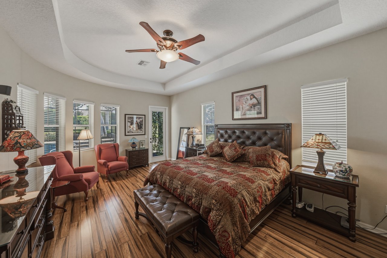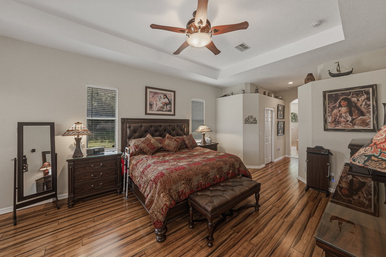 while a high tray ceiling adds dimension overhead. Rich wood flooring continues into the formal