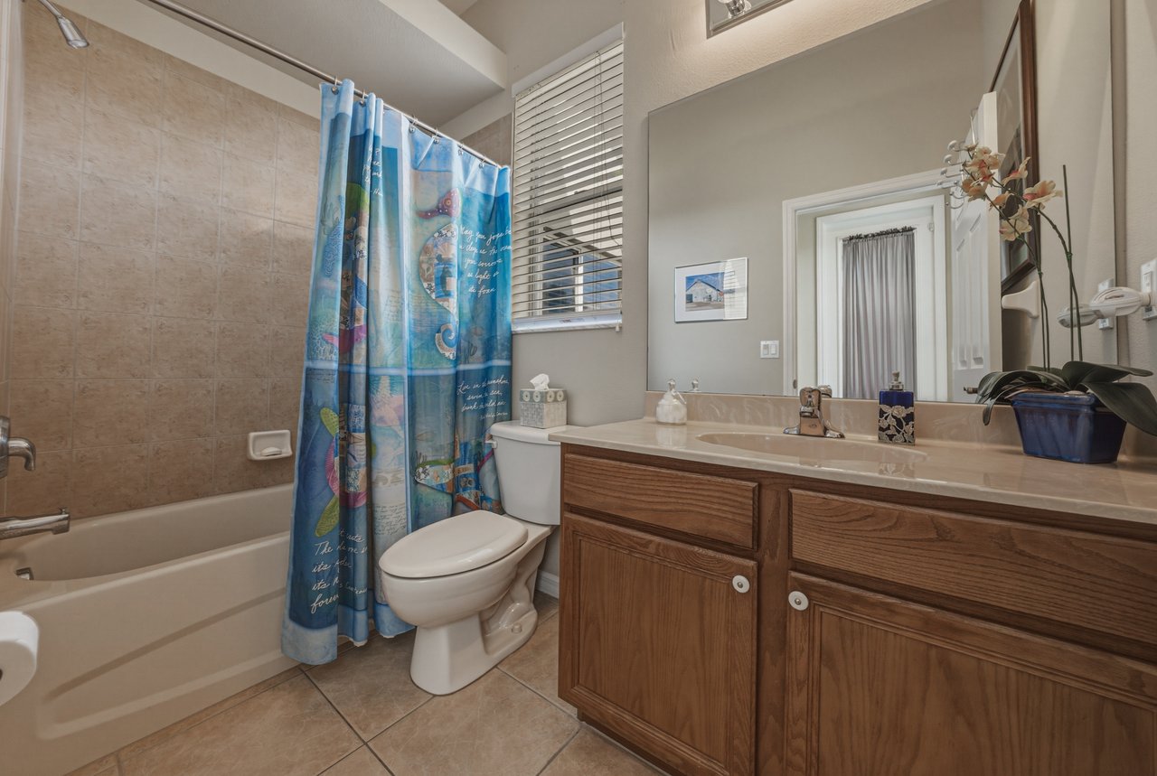 a full bath with nearby access to the pool area adds convenience for guests and outdoor