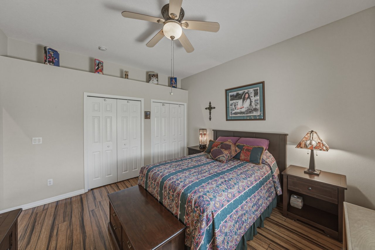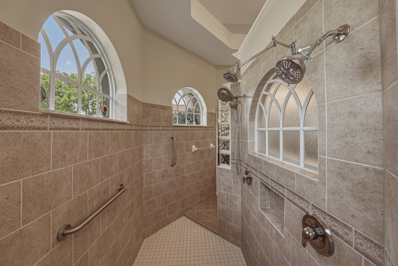 fans, and one offers a large walk-in closet. Nearby, the third full bath provides a long vanity and