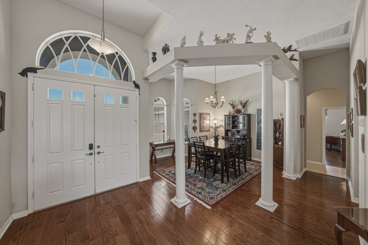 dining room, where architectural pillars give the space style and definition. Overlooking the