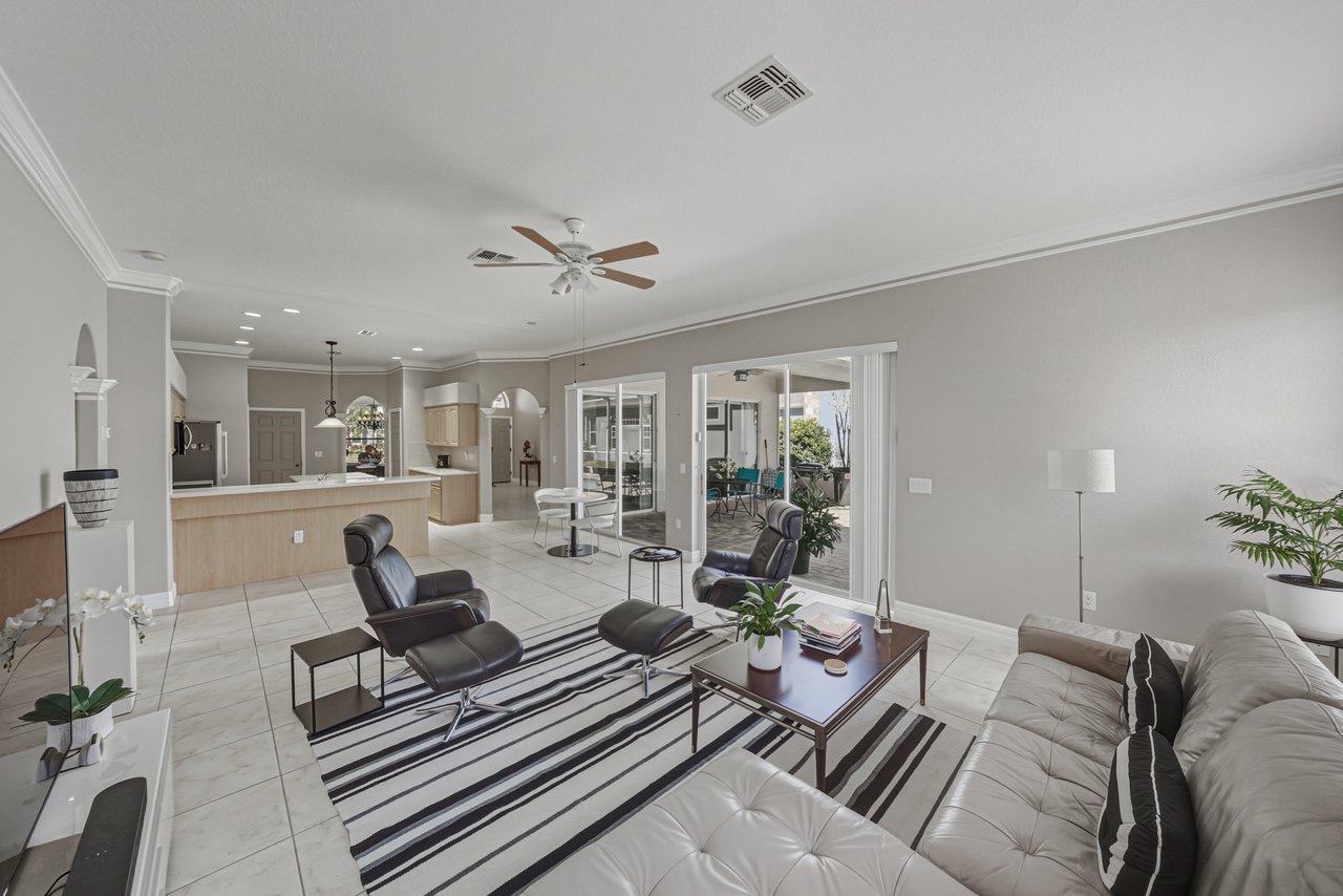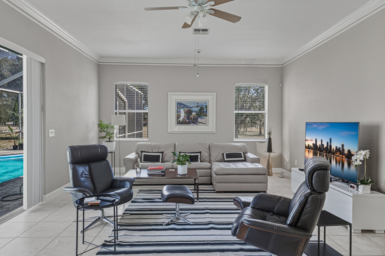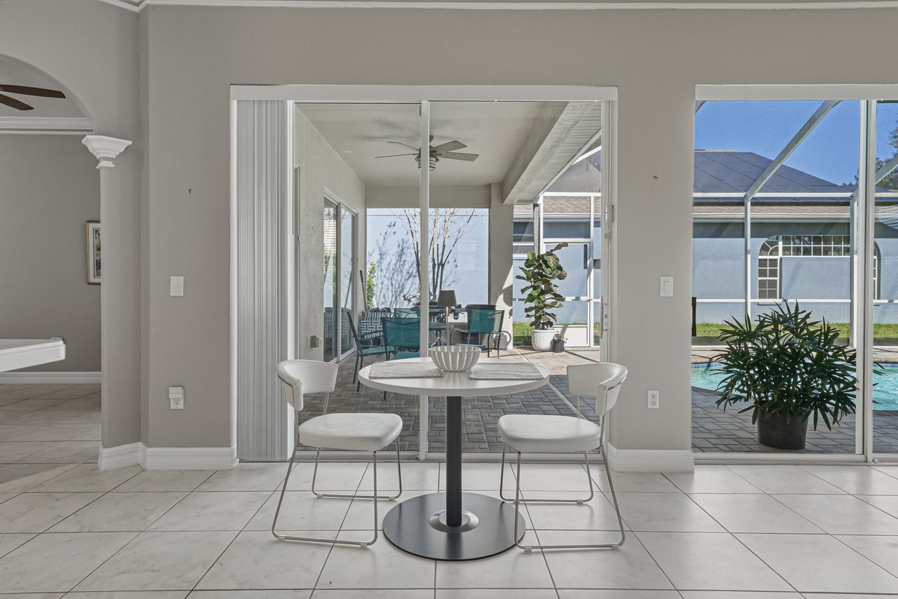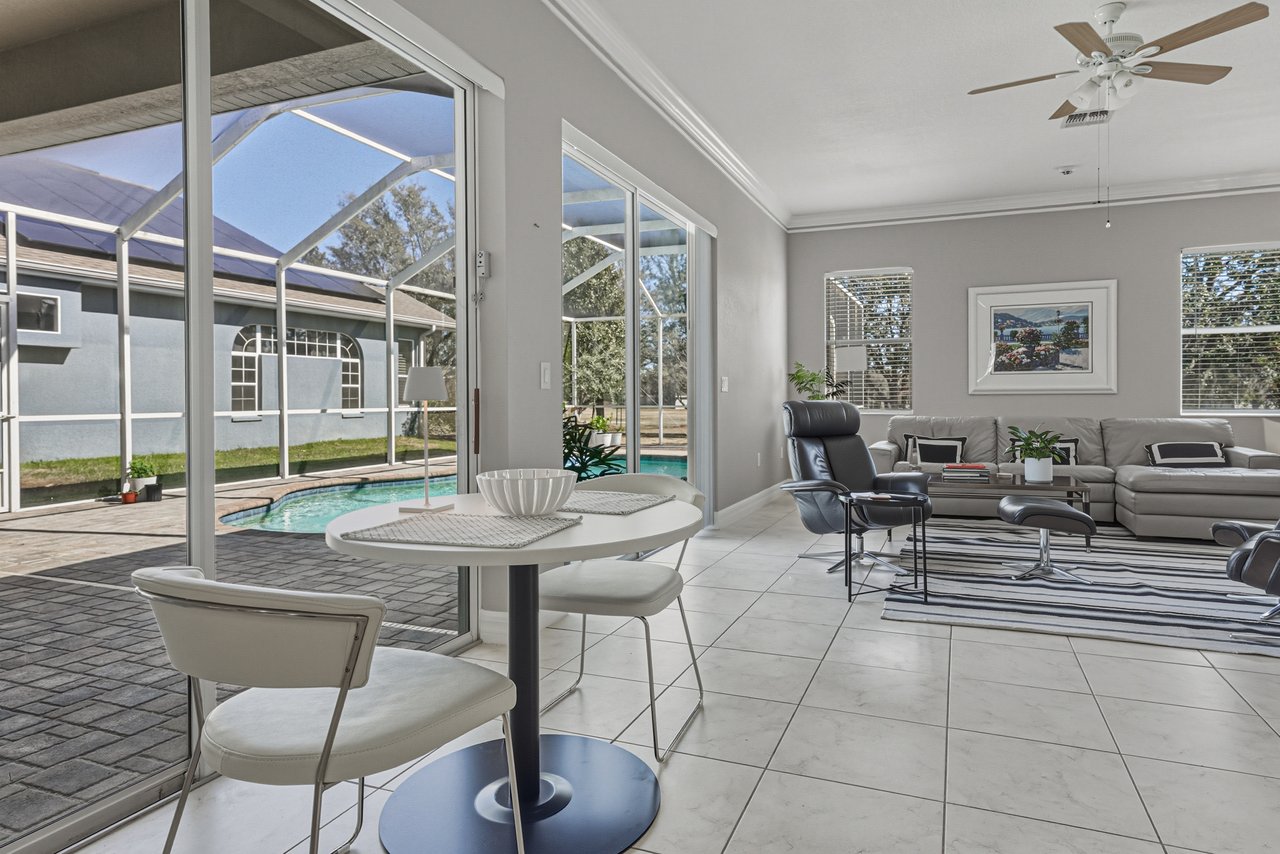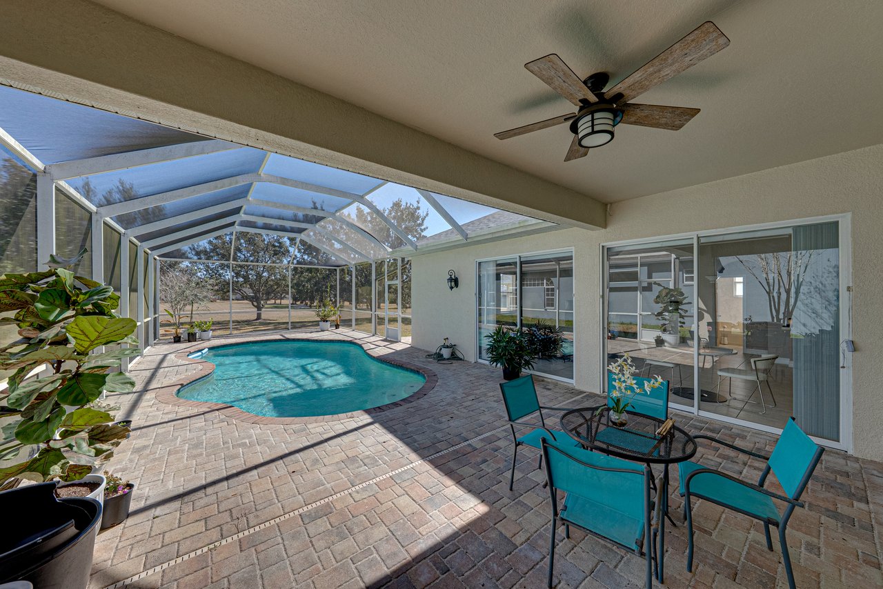 Backing up to Lake Jovita's walking trails and park, this 3 bedroom, 2 bath pool home pairs a coveted location with fresh updates including a 2024 roof, a newer AC, and a newer water heater- completely ready for effortless Florida living inside the gates of Lake Jovita. Arrival is warm and welcoming with a freshly painted exterior, mature trees, and a paver walkway that leads to a charming front porch made for morning coffees and neighborhood people-watching. Step inside and the layout opens with a paired formal living and dining space at the front of the home, connected enough for gatherings yet still intimate. The formal living room includes sliding doors to the pool, adding natural light and a touch of indoor-outdoor charm. Tile flooring, crown molding, and soft neutral paint carry through the main living areas, guiding you toward the true heart of the home: an expansive family room and kitchen designed as one bright, open space with multiple sliders, welcoming in sunshine and framing sparkling pool views. The kitchen is thoughtfully arranged with ample solid-surface prep space, a central island, breakfast bar seating, new stainless steel appliances, generous pantry storage, and a cozy eat-in dinette, ideal for casual meals with a view. A split bedroom layout keeps the primary suite tucked away for privacy. Wood flooring, direct pool access, and two spacious walk-in closets set the stage for comfort, while the ensuite features dual sinks and a walk-in shower. Bedrooms two and three sit on the opposite side of the home with a full bath between them, complete with a tub/shower combination. Outdoors, the lanai invites you to slow down and savor the Florida lifestyle. Pavers surround the sparkling pool, and a covered sitting area offers shade for relaxing afternoons or outdoor dining. Beyond the screened enclosure, the backyard connects directly to Lake Jovita's scenic walking trails and park amenities, including pickleball, basketball, and a playground, all just steps away. Optional memberships are available as well, offering access to Lake Jovita's two 18-hole golf courses, fitness center, clubhouse, Jr. Olympic size swimming pool, tennis courts, and more! Call today to schedule your private showing and experience Lake Jovita living at its best.