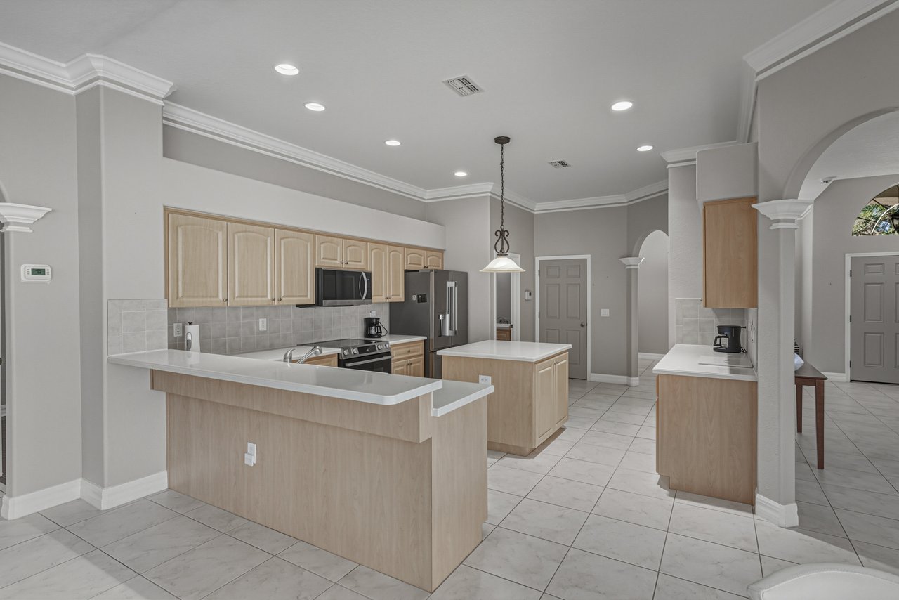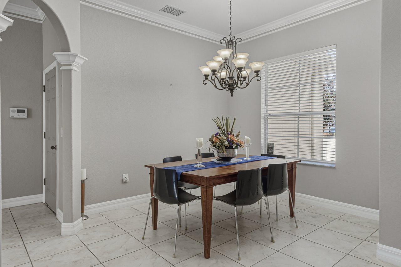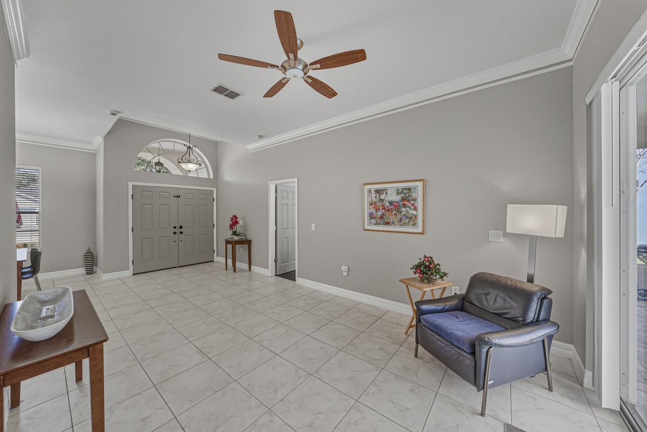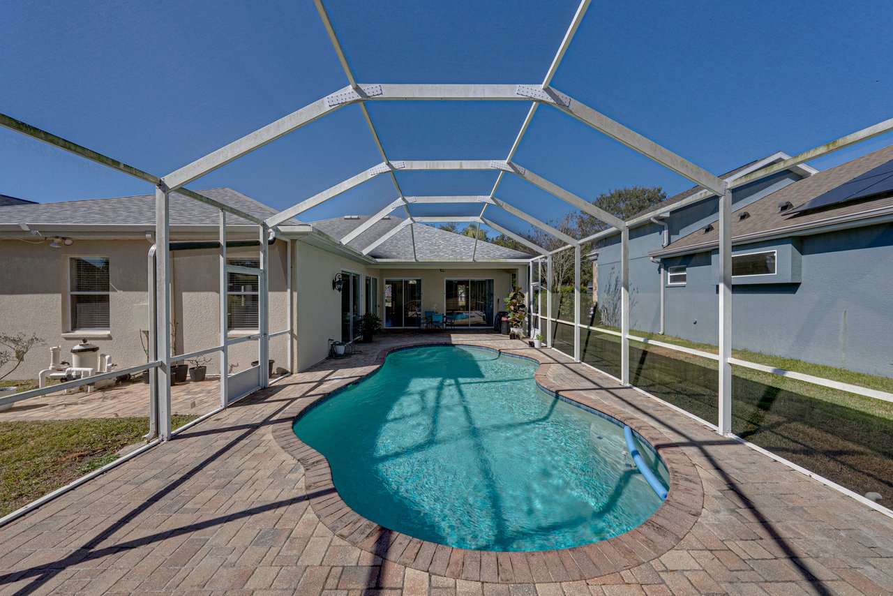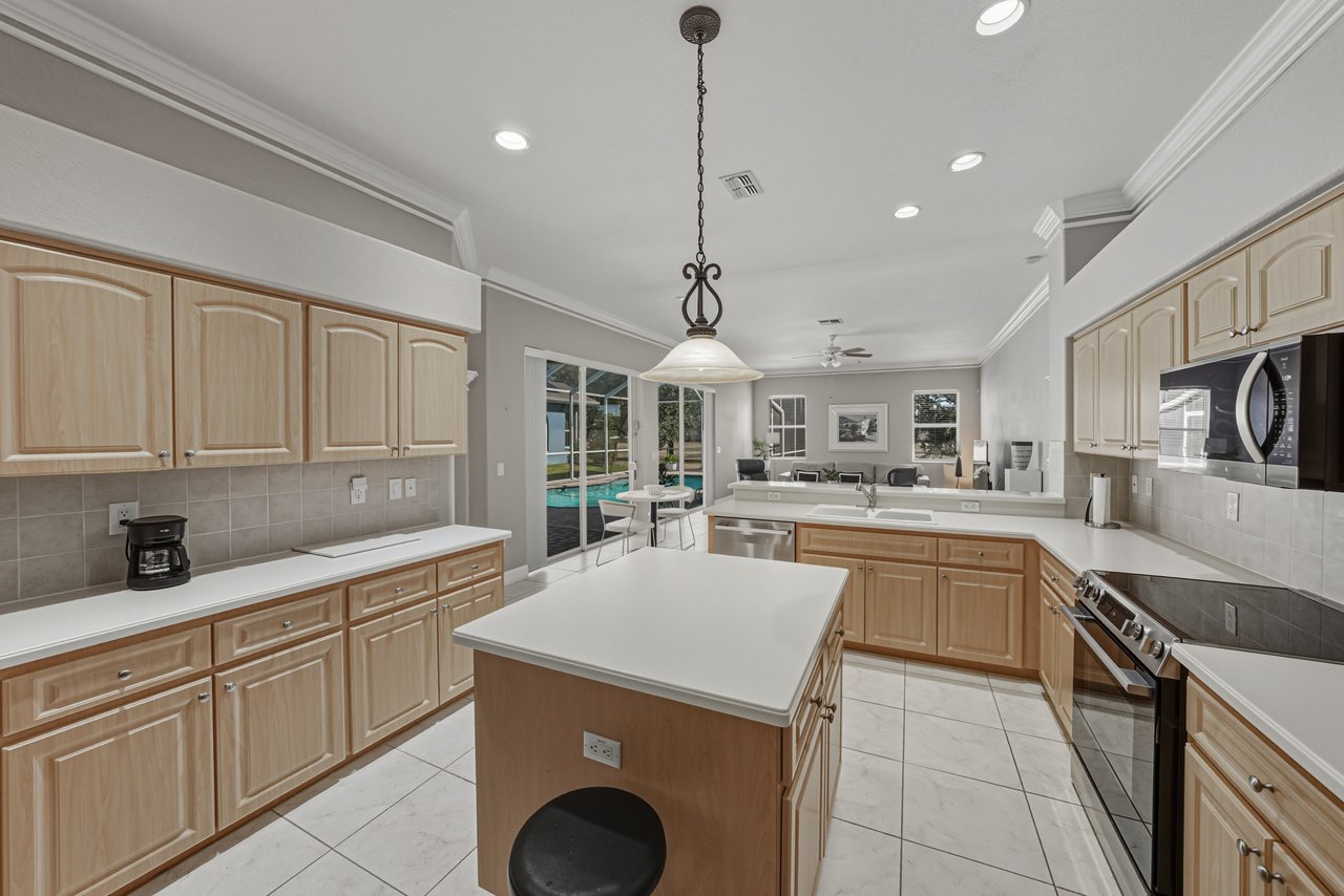 Backing up to Lake Jovita's walking trails and park, this 3 bedroom, 2 bath pool home pairs a coveted location with fresh updates including a 2024 roof, a newer AC, and a newer water heater- completely ready for effortless Florida living inside the gates of Lake Jovita. Arrival is warm and welcoming with a freshly painted exterior, mature trees, and a paver walkway that leads to a charming front porch made for morning coffees and neighborhood people-watching. Step inside and the layout opens with a paired formal living and dining space at the front of the home, connected enough for gatherings yet still intimate. The formal living room includes sliding doors to the pool, adding natural light and a touch of indoor-outdoor charm. Tile flooring, crown molding, and soft neutral paint carry through the main living areas, guiding you toward the true heart of the home: an expansive family room and kitchen designed as one bright, open space with multiple sliders, welcoming in sunshine and framing sparkling pool views. The kitchen is thoughtfully arranged with ample solid-surface prep space, a central island, breakfast bar seating, new stainless steel appliances, generous pantry storage, and a cozy eat-in dinette, ideal for casual meals with a view. A split bedroom layout keeps the primary suite tucked away for privacy. Wood flooring, direct pool access, and two spacious walk-in closets set the stage for comfort, while the ensuite features dual sinks and a walk-in shower. Bedrooms two and three sit on the opposite side of the home with a full bath between them, complete with a tub/shower combination. Outdoors, the lanai invites you to slow down and savor the Florida lifestyle. Pavers surround the sparkling pool, and a covered sitting area offers shade for relaxing afternoons or outdoor dining. Beyond the screened enclosure, the backyard connects directly to Lake Jovita's scenic walking trails and park amenities, including pickleball, basketball, and a playground, all just steps away. Optional memberships are available as well, offering access to Lake Jovita's two 18-hole golf courses, fitness center, clubhouse, Jr. Olympic size swimming pool, tennis courts, and more! Call today to schedule your private showing and experience Lake Jovita living at its best.