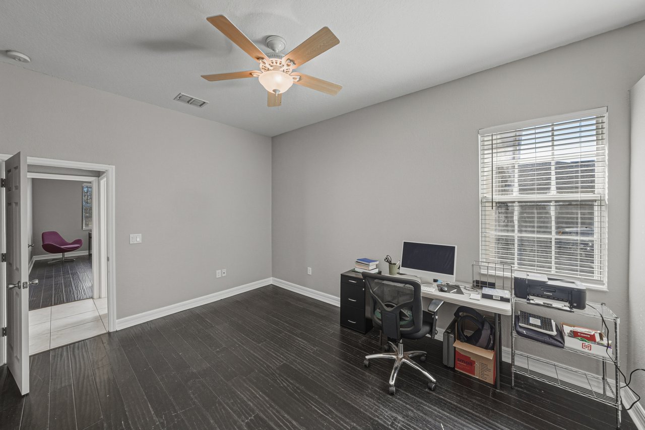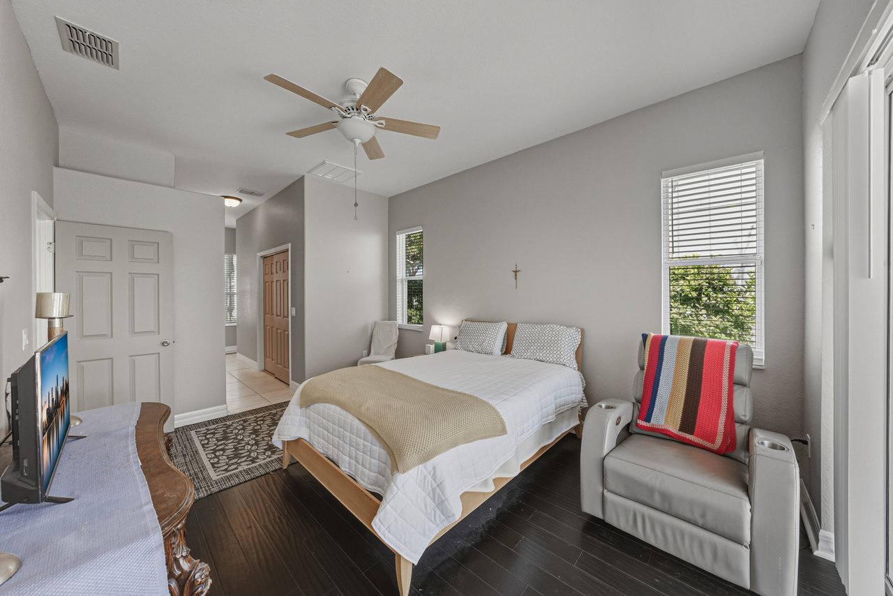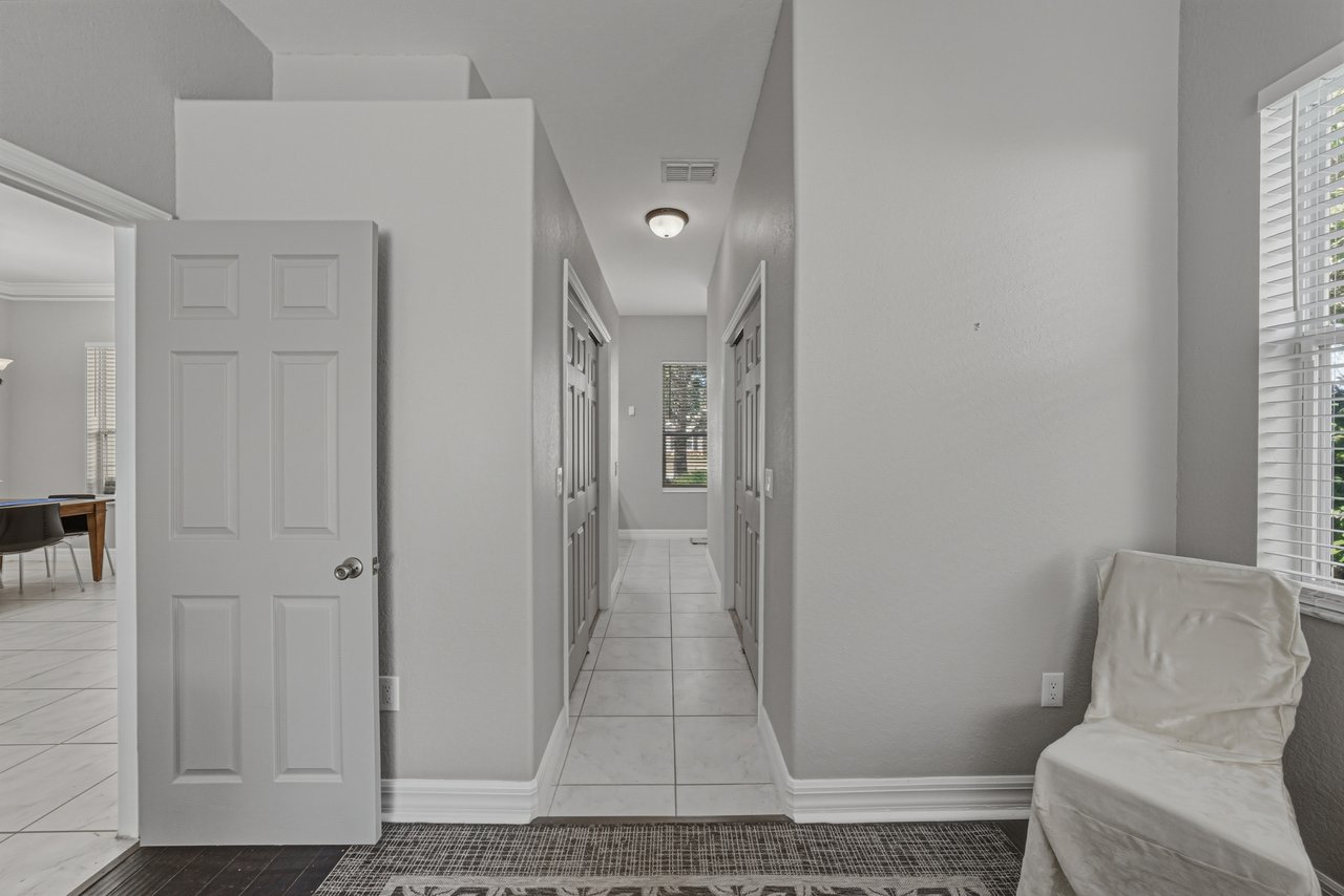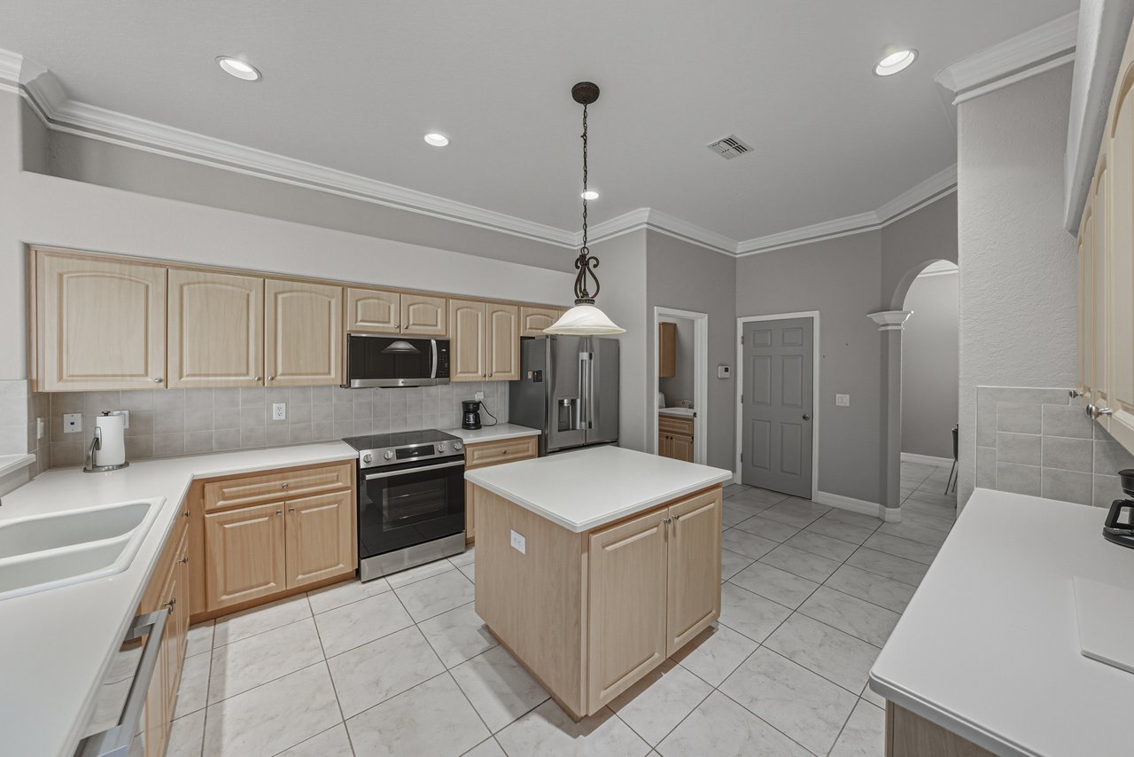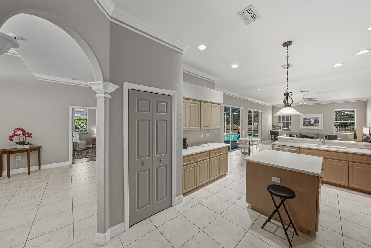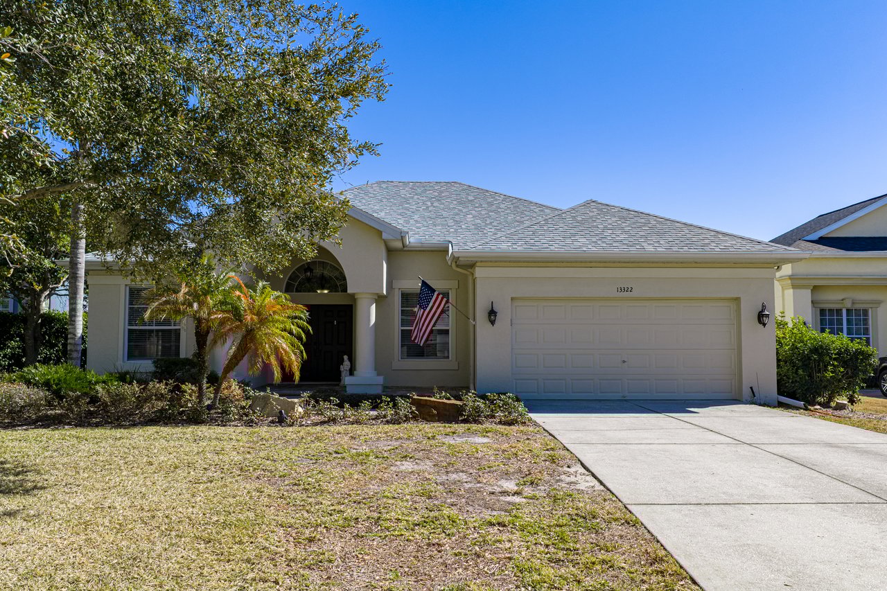 Backing up to Lake Jovita's walking trails and park, this 3 bedroom, 2 bath pool home pairs a coveted location with fresh updates including a 2024 roof, a newer AC, and a newer water heater- completely ready for effortless Florida living inside the gates of Lake Jovita. Arrival is warm and welcoming with a freshly painted exterior, mature trees, and a paver walkway that leads to a charming front porch made for morning coffees and neighborhood people-watching. Step inside and the layout opens with a paired formal living and dining space at the front of the home, connected enough for gatherings yet still intimate. The formal living room includes sliding doors to the pool, adding natural light and a touch of indoor-outdoor charm. Tile flooring, crown molding, and soft neutral paint carry through the main living areas, guiding you toward the true heart of the home: an expansive family room and kitchen designed as one bright, open space with multiple sliders, welcoming in sunshine and framing sparkling pool views. The kitchen is thoughtfully arranged with ample solid-surface prep space, a central island, breakfast bar seating, new stainless steel appliances, generous pantry storage, and a cozy eat-in dinette, ideal for casual meals with a view. A split bedroom layout keeps the primary suite tucked away for privacy. Wood flooring, direct pool access, and two spacious walk-in closets set the stage for comfort, while the ensuite features dual sinks and a walk-in shower. Bedrooms two and three sit on the opposite side of the home with a full bath between them, complete with a tub/shower combination. Outdoors, the lanai invites you to slow down and savor the Florida lifestyle. Pavers surround the sparkling pool, and a covered sitting area offers shade for relaxing afternoons or outdoor dining. Beyond the screened enclosure, the backyard connects directly to Lake Jovita's scenic walking trails and park amenities, including pickleball, basketball, and a playground, all just steps away. Optional memberships are available as well, offering access to Lake Jovita's two 18-hole golf courses, fitness center, clubhouse, Jr. Olympic size swimming pool, tennis courts, and more! Call today to schedule your private showing and experience Lake Jovita living at its best.