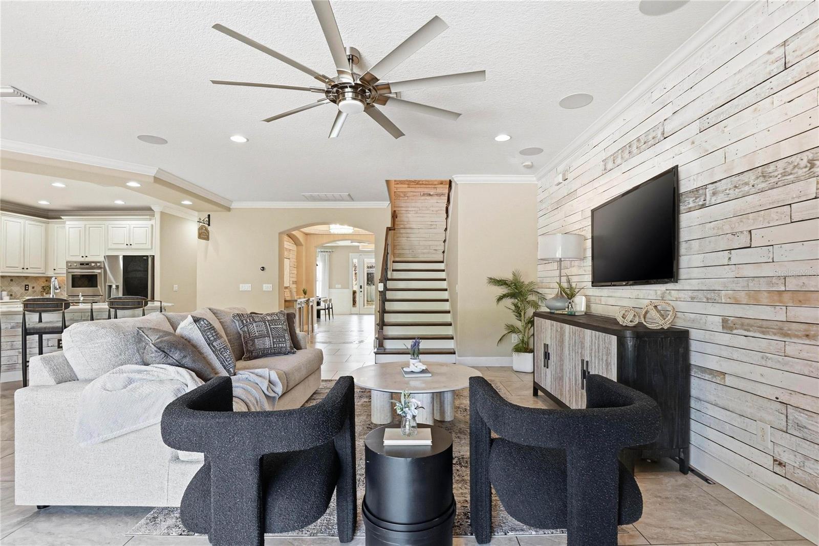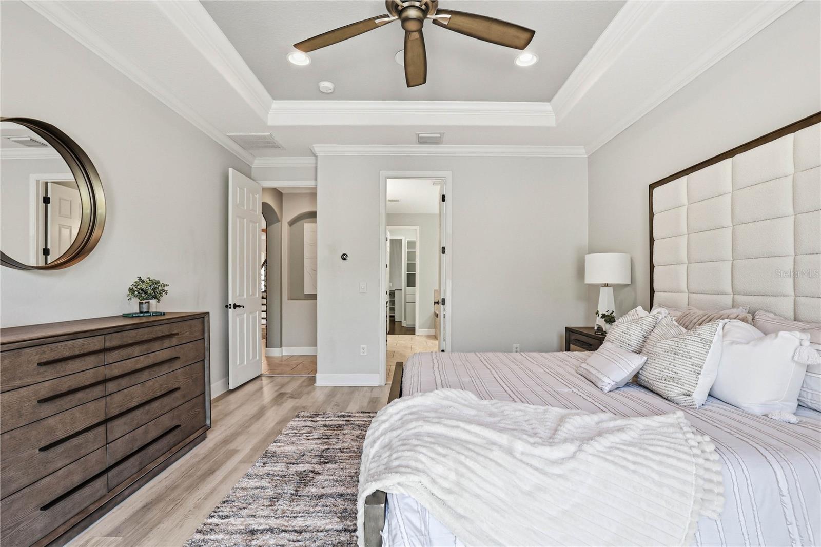 crown molding, tray ceilings, elevated lighting, warm neutral paint, shiplap feature walls, built-in
