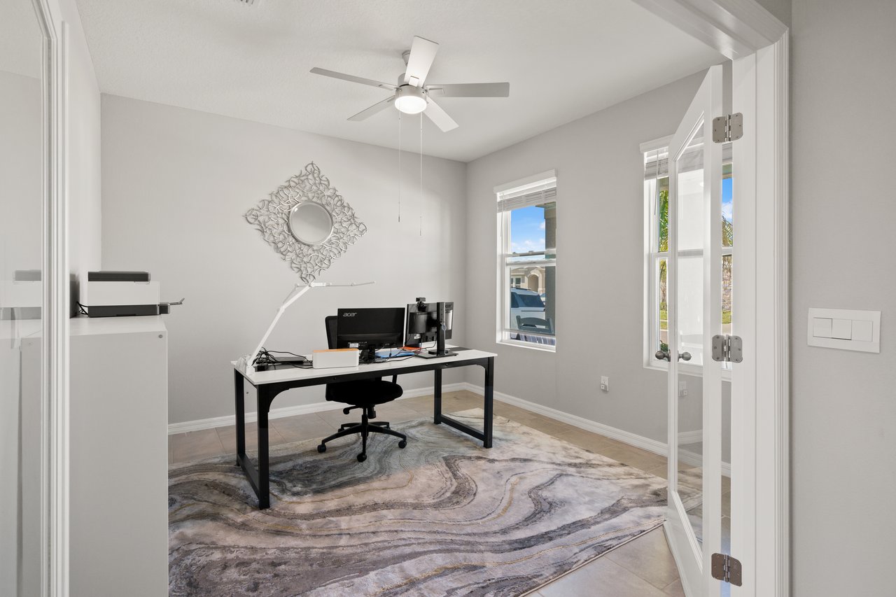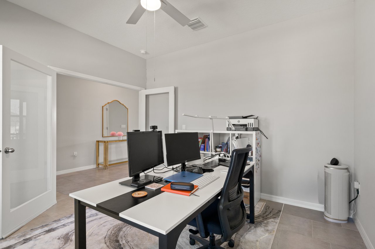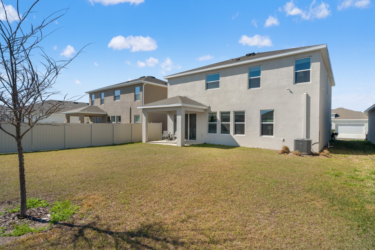 Sunset walks to community events, mornings on the porch with coffee in hand, afternoons at the resort-style pool, and evenings gathered in a home designed to bring everyone together. Life in Avalon Park is vibrant, connected, and effortlessly elevated and this beautifully appointed two story residence places you right at the center of it all. Set within one of Wesley Chapel's most dynamic master planned communities spanning 1,600 thoughtfully designed acres, this 5 bedroom + office, 3 bath, 2 car garage home offers a refined yet flexible layout ideal for growing households, multi generational living, or those who simply value generous, well designed space. The approach leaves a lasting impression with sidewalk lined streets, attractive stone accents, modern neutral exterior tones, mature landscaping, and a charming front porch that invites relaxed evenings and friendly conversation. Inside, natural light pours into the open concept living area where tile flooring, abundant windows, and recessed lighting create a bright yet sophisticated atmosphere with a seamless flow for entertaining. At the center of the home, the chef's kitchen offers a generous island with breakfast bar seating, stainless steel appliances, vibrant brushed brass fixtures including a touchless faucet and updated cabinetry hardware, a reverse osmosis system at the sink, stone countertops, a butler's pantry/coffee bar, and a roomy walk-in pantry. It all overlooks the dining area with triple sliding doors that open to the covered back porch and yard, creating an effortless indoor to outdoor connection. Near the front of the home, a private office with double door entry provides a quiet space to work or study, while a first floor guest bedroom and full bathroom, also on the first floor, offer comfort and convenience for visitors. Upstairs, a plush carpeted staircase leads to an expansive and versatile loft that can easily serve as a second living room, playroom, or additional office space. Even better, it includes a huge walk-in closet for added storage. The primary suite is thoughtfully secluded from the secondary bedrooms and features a generous walk-in closet and a tranquil ensuite bath with dual sinks, a glass enclosed walk-in shower, and a separate soaking tub. Three additional spacious bedrooms, a third full bath with a tub/shower combo, and a convenient second floor laundry room complete the upper level. Added bonuses such as a whole house water softener, window blinds throughout, a security system with cameras, and thoughtful design choices provide added value and peace of mind. Authentic Florida living awaits outdoors, whether you are relaxing on your covered back porch or enjoying the incredible resort style amenities Avalon Park is known for. Residents gather at the pool, heated spa, splash pad, and playground, and look forward to community events like the Absolutely Avalon Fourth of July firework show. With top rated schools, shopping, and dining woven throughout the community, living in this stunning home is more than just a change of location- its a change of lifestyle. Call today to see if it is the right choice for you!